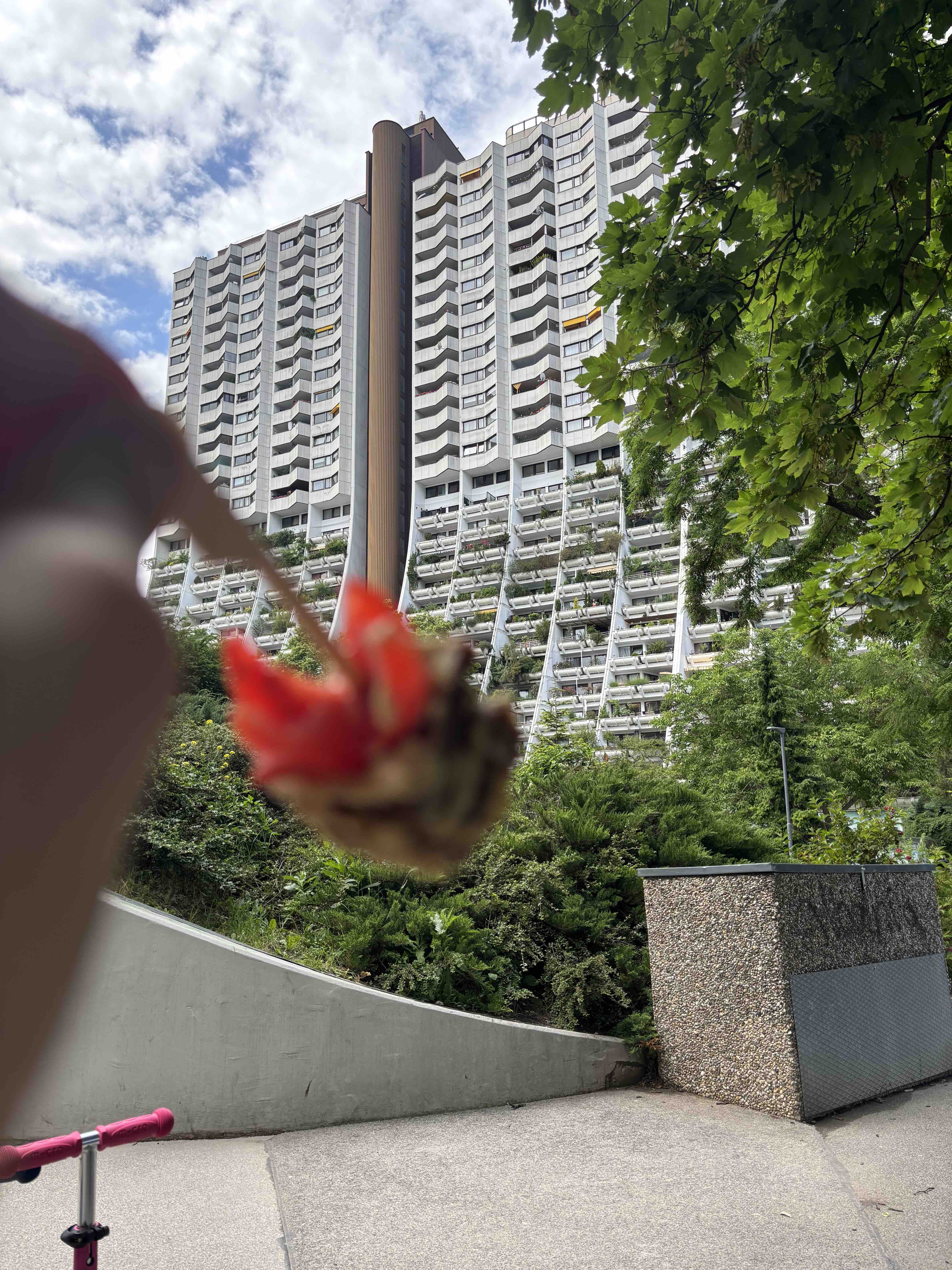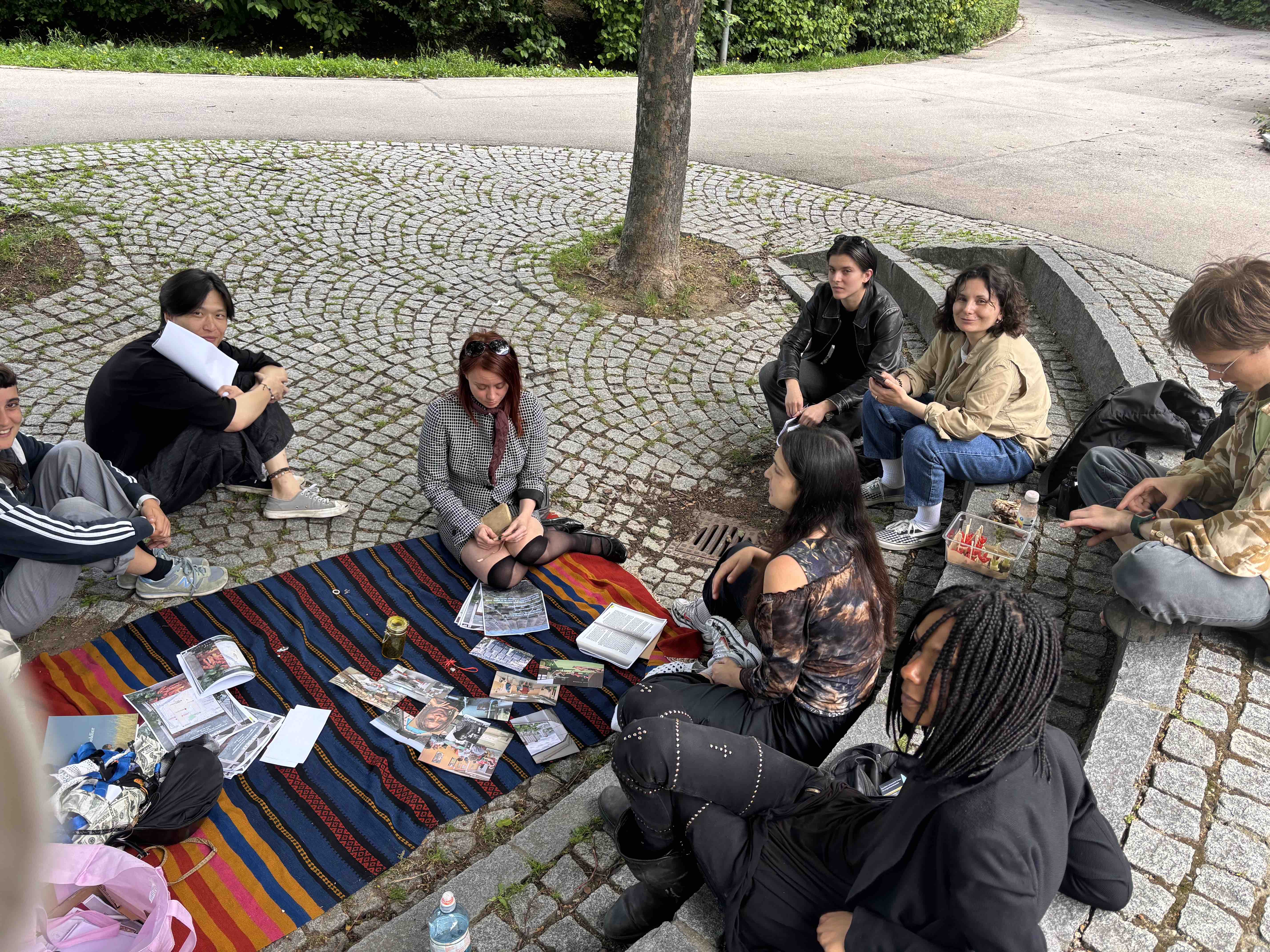 The course was organized around a series of practical exercises (f.e Oliveros text scores) and engagements (Corita Kent assignements) to enlarge one’s ability to actively read the organization of the socio-political spaces. We visited together different architectural places of curiosity outside of the city center of Vienna in order to explore one’s engagement in the local context and artistic practices in relation to the politics and aesthetics of the cityscape. Different historical stories and fabulas as well as political texts were used as ignition spark to drift into one’s own fantasy, feelings and myriad relations to the spaces. Together we dwelled on failures of modernism, historical Red Vienna, late 20th century fantasies of the united world, hidden anarchistic islands and one’s own creative practice in the midst of this world of polycrises. At the end of the course students worked independently on their final presentation reflecting on how environments influence their artistic practice and why.