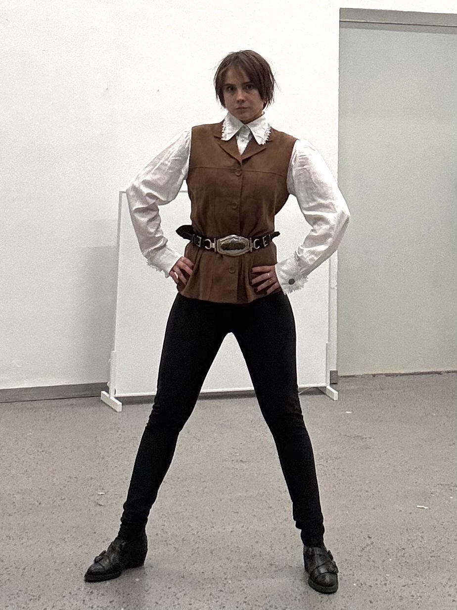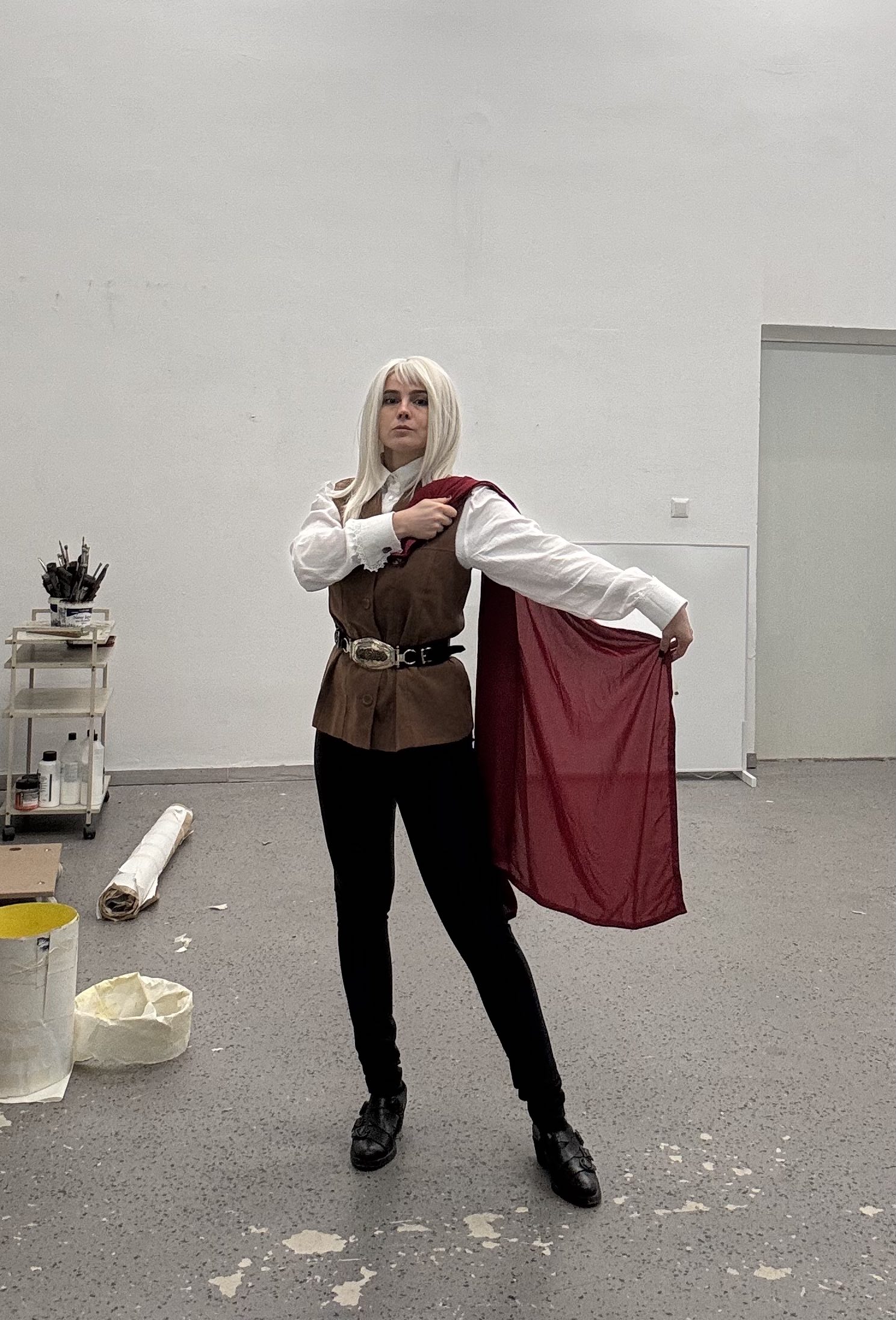 red cape, blond wig, leather vest, white shirt, metal belt, tight pants, spoken word with snippets from the film "Last Relic"