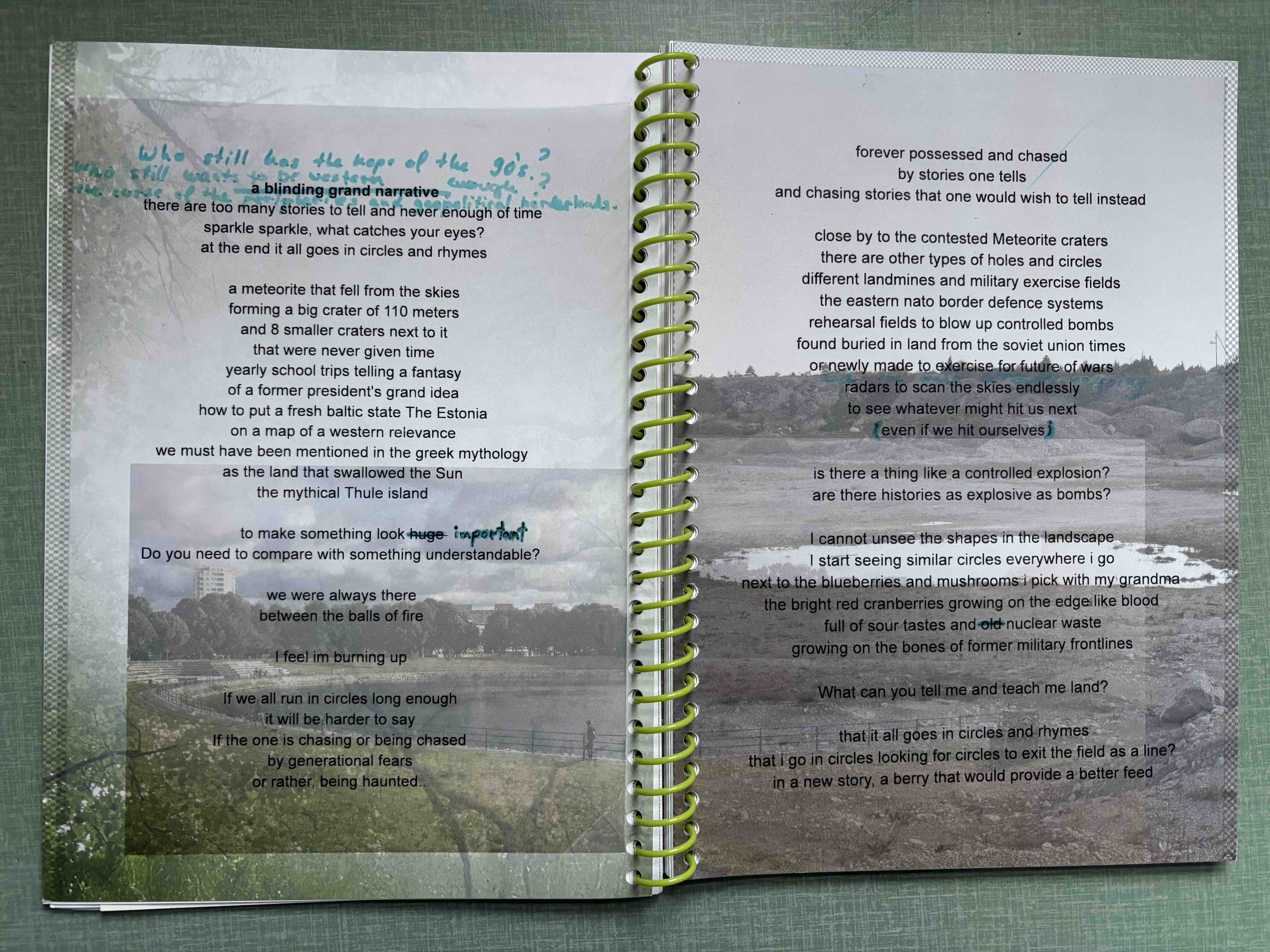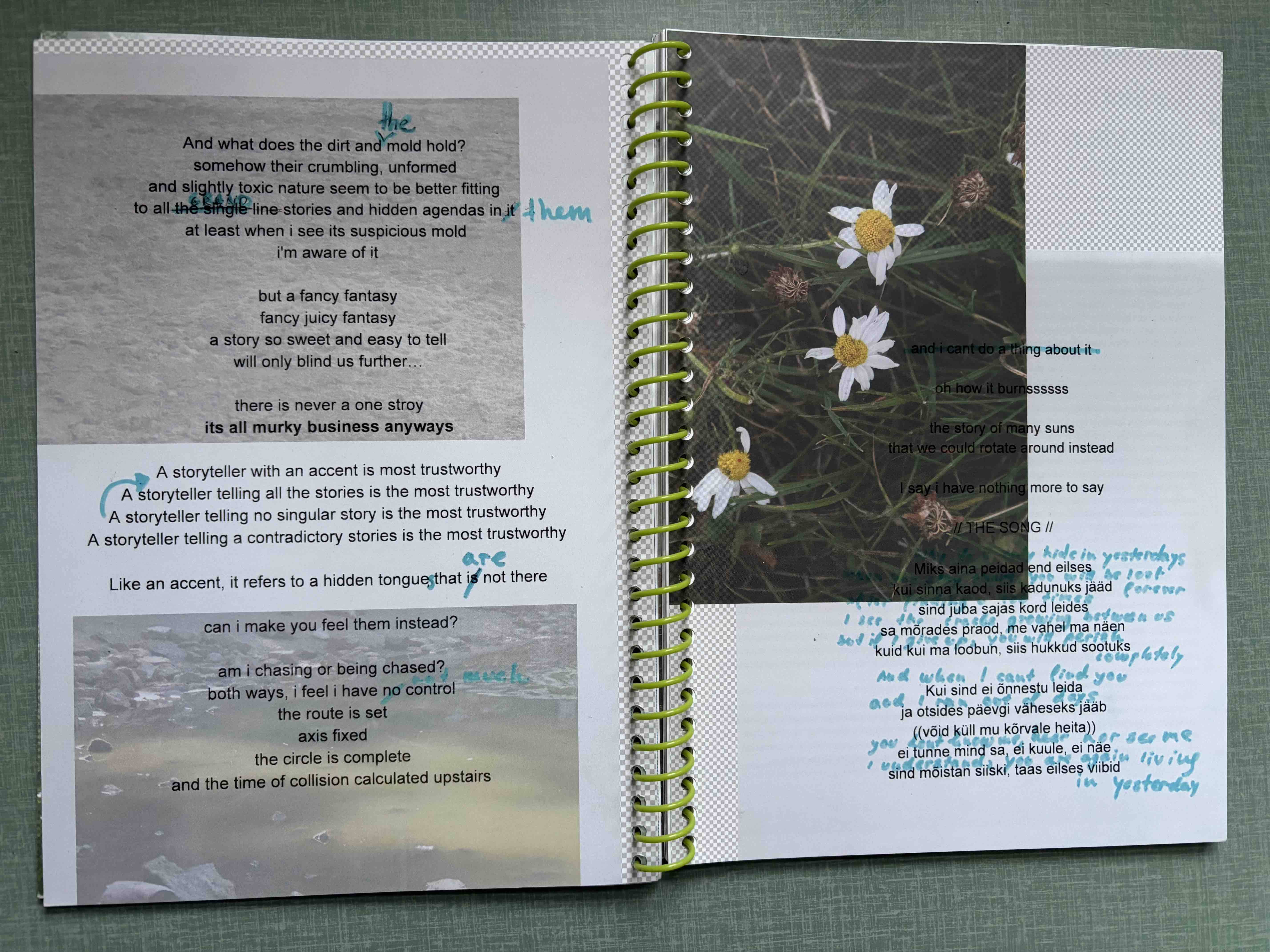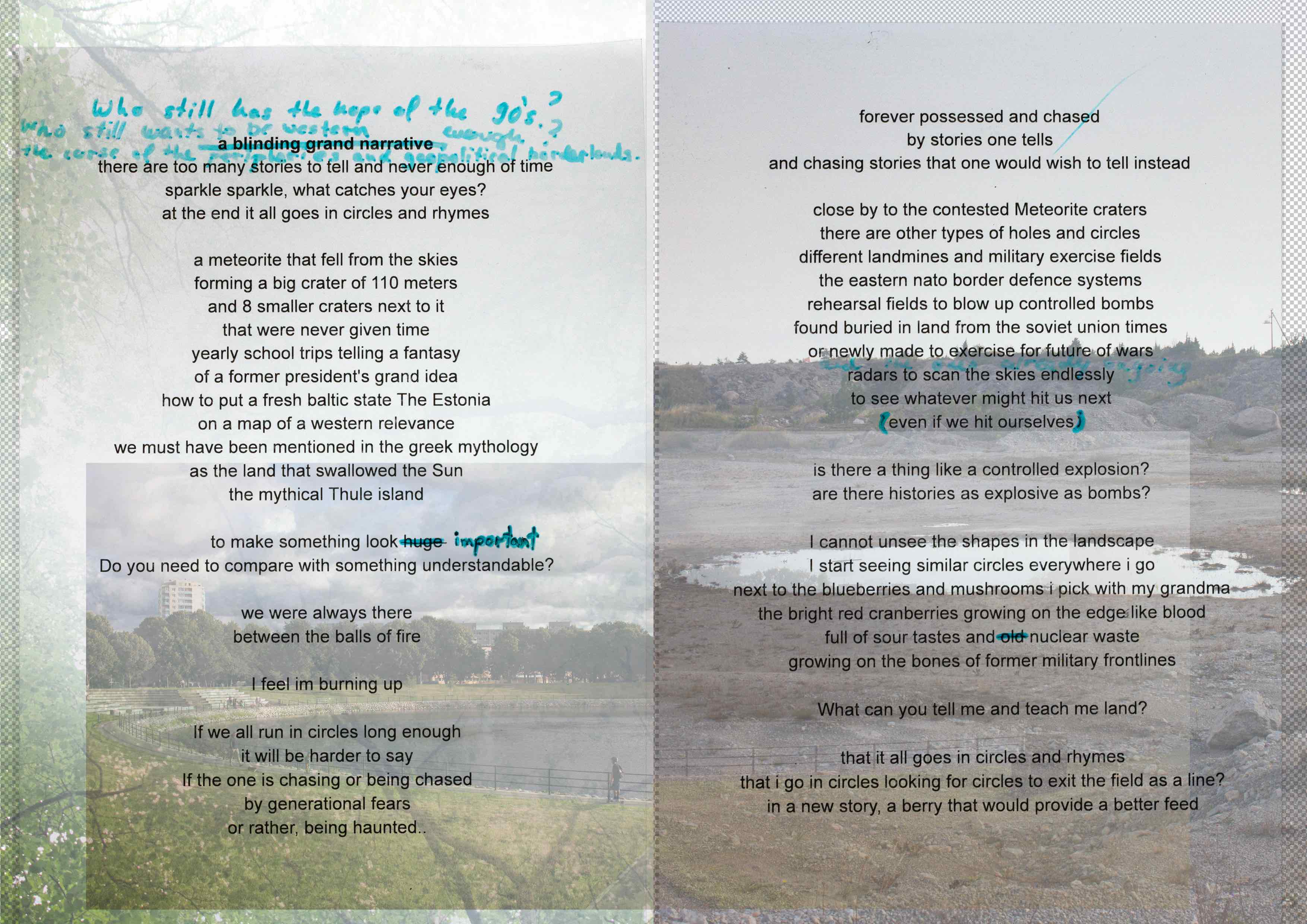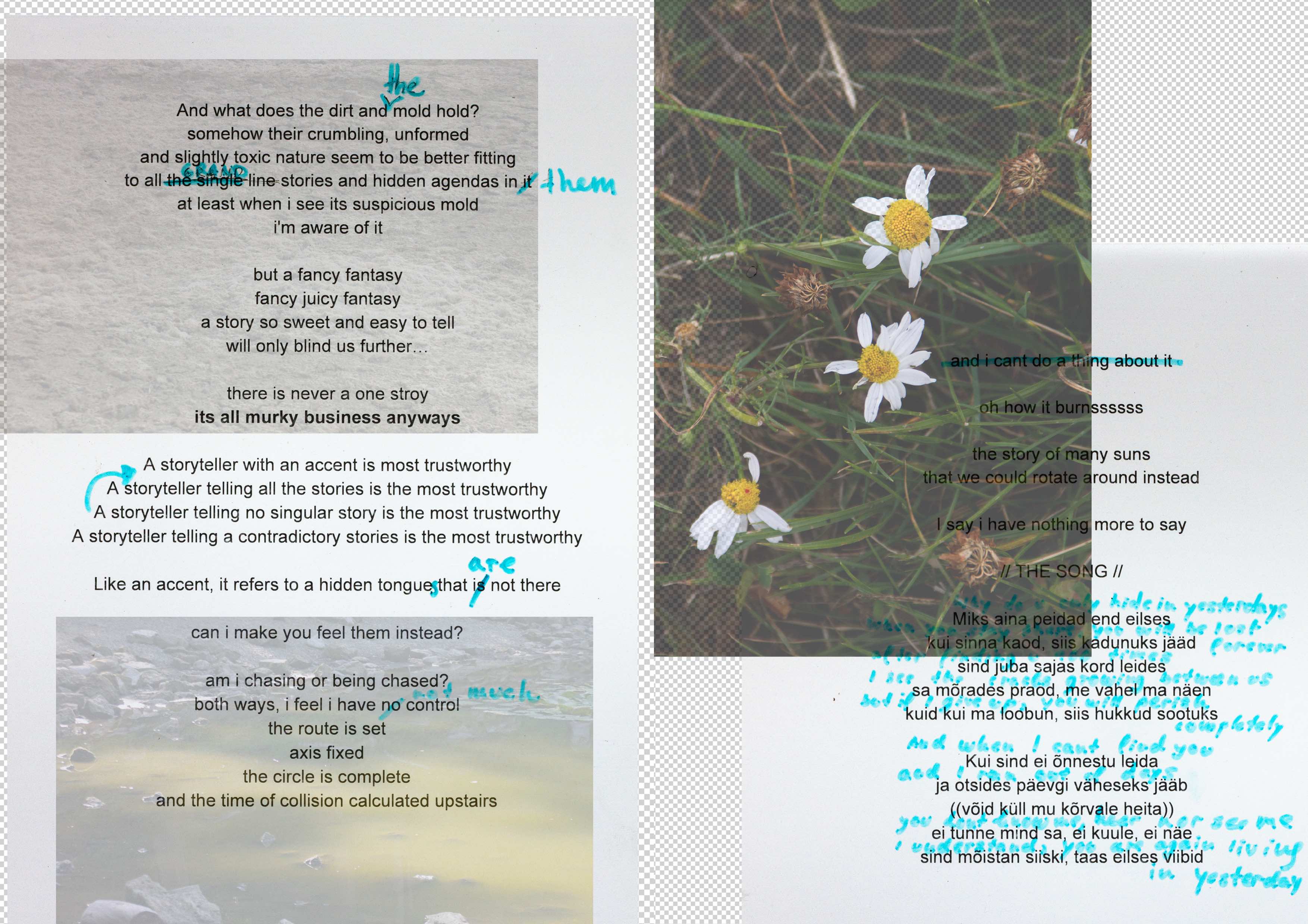In my writing practice I struggle a lot with the clearness of the written word on paper and its rigid nature it brings into academic writing. I always find meanings that are in process or shifting more curious, being closer to performative aspects of oral storytelling. The texts presented here is one of my text scores for a performance called Murky Business. In it I was trying to experiment with alternative ways of political and poetic storytelling, where the meaning of the words depends on different layers of complexity that accumulate over the course of the performance. Through a 90s pop song from an Estonian singer, Maarja Liis Ilus (called "Keelatud maa", which translates to The "Forbidden Land") and over-the-top stage makeup, shifts between different styles of singing and speaking, I tried to explore a way of inhabiting different knowledge of different times, while constantly underlining their contradictions and gaps, or repeating patterns between them. Due to the added layers during the performance, something that seemed as a naive pop song about love grows into a dark confession of being lost and afraid of disappearance of one's land and existence.