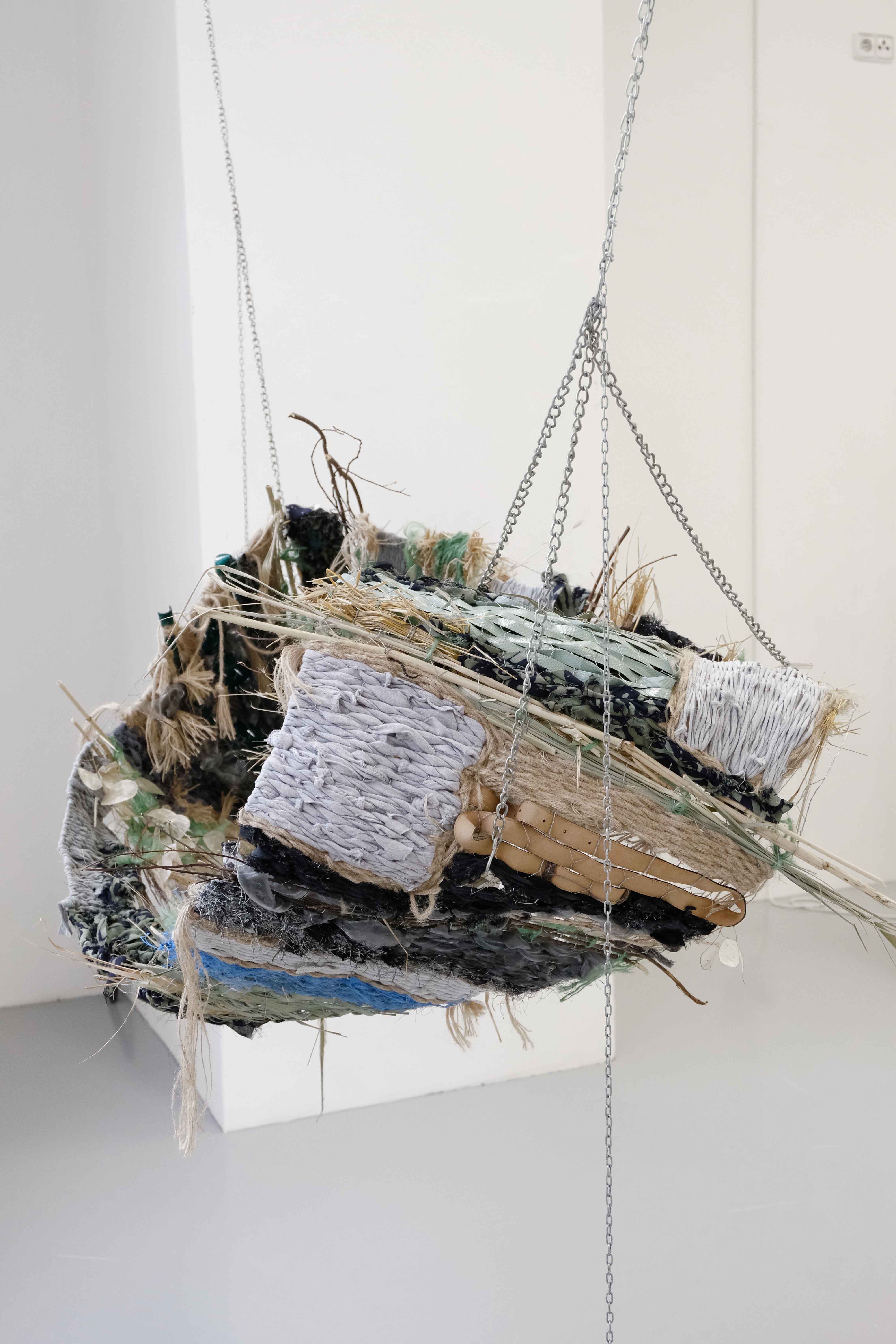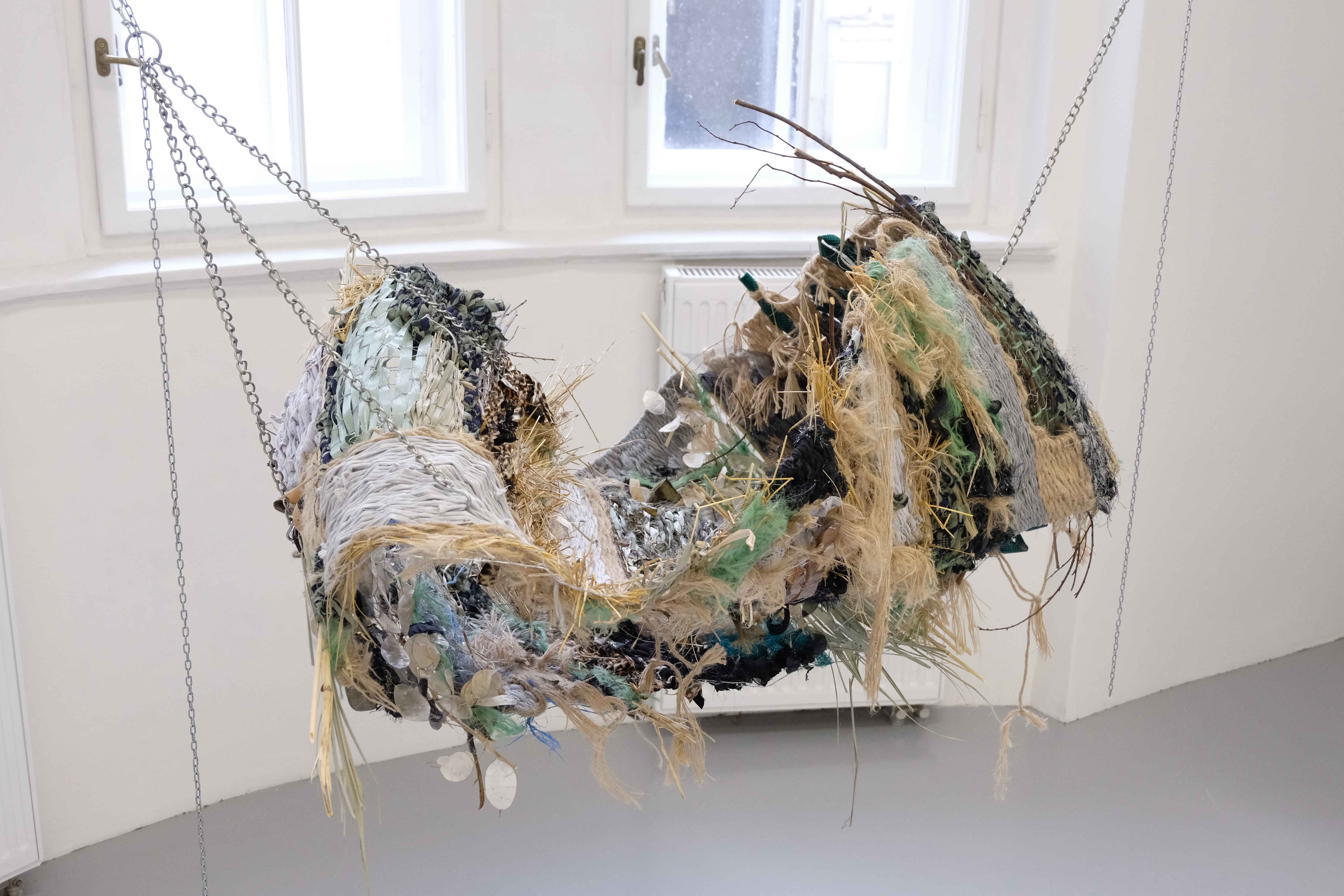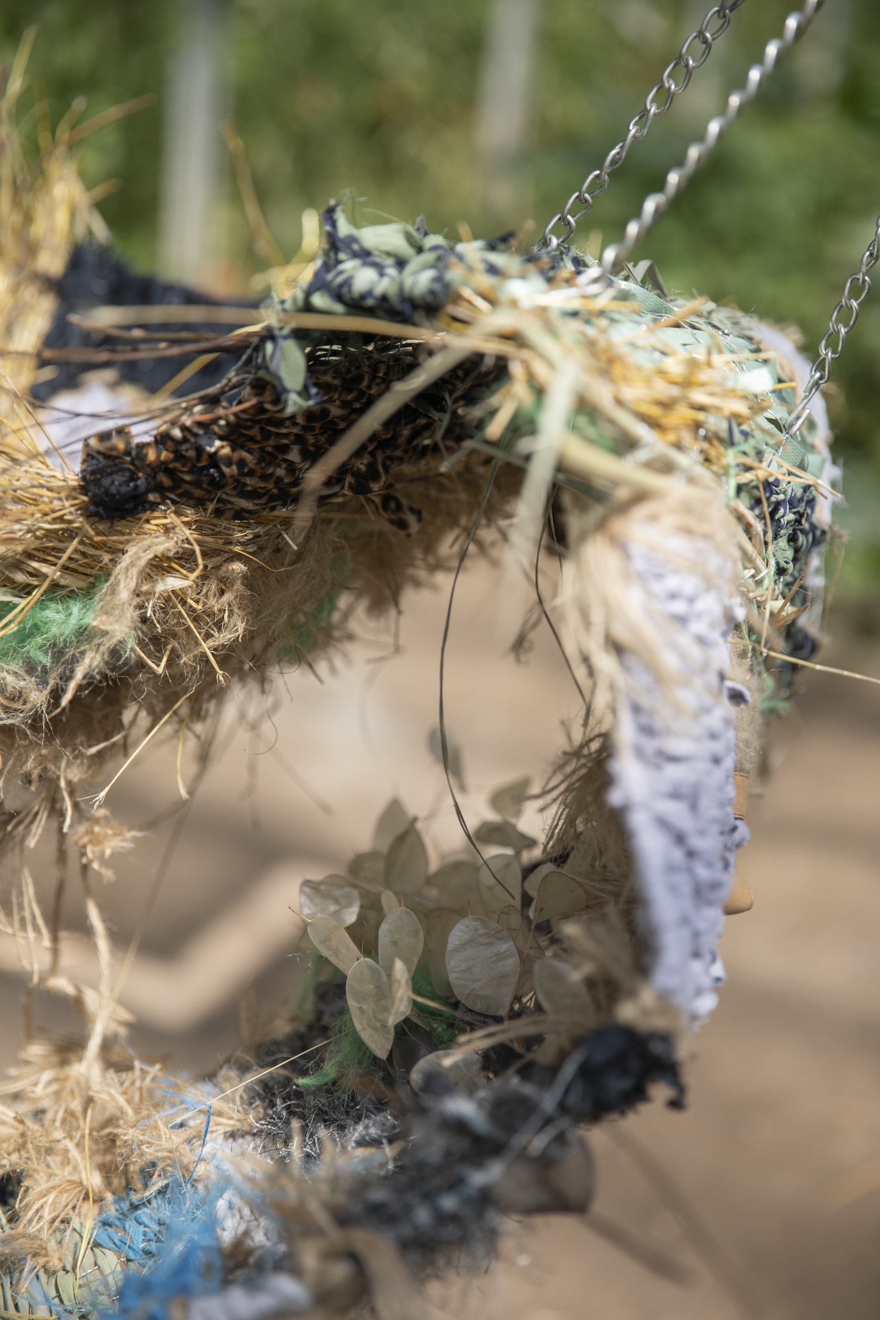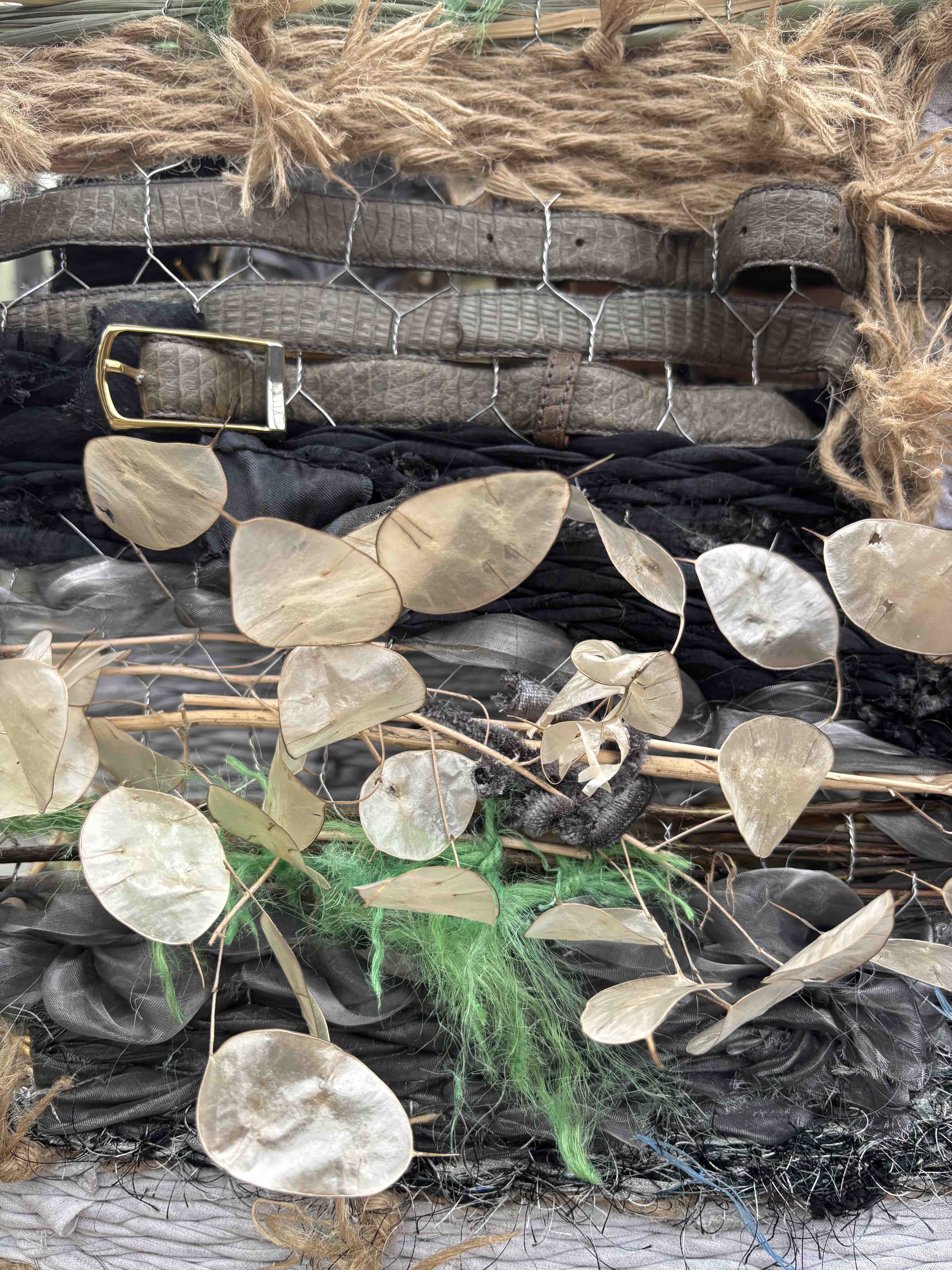 The sculpture is woven out of found objects in the farm, animal-print clothes from the secondhand shops and the many interactions gathered during the symposium. Like the story of the snake, who came to the artist Nikolaus’s studio to eat a mouse caught in the trap, or the mystery of the sudden appearance of crustaceans in the yard: Stadtfarm in Vienna can with it's beautiful lushness of nature reservoir between gray heavily trafficked highways leave one often with the feeling of vertigo. The crossing entanglements and unexpected patterns provide a constant of interrelated growths. Woven during the time spent there, the weaving became like a diary of those relation, reflecting in and out of the process. The shape of the sculpture Möbius strip is taken from the concept of physics, where one cant clearly tell which side of the surface they are, when following the shape with their hand or eyes. The shape rotates itself around in a constant process and what is usually inside, is also at one point outside of the shape. In relation to the Kleine Stadt farm, whose manifold work is dedicated to city environmental farming and sustainability, the work questions what feels like nature and what is considered natural (leopard print pants as camouflage in Europe?) in anthropogenic world in polycrises.