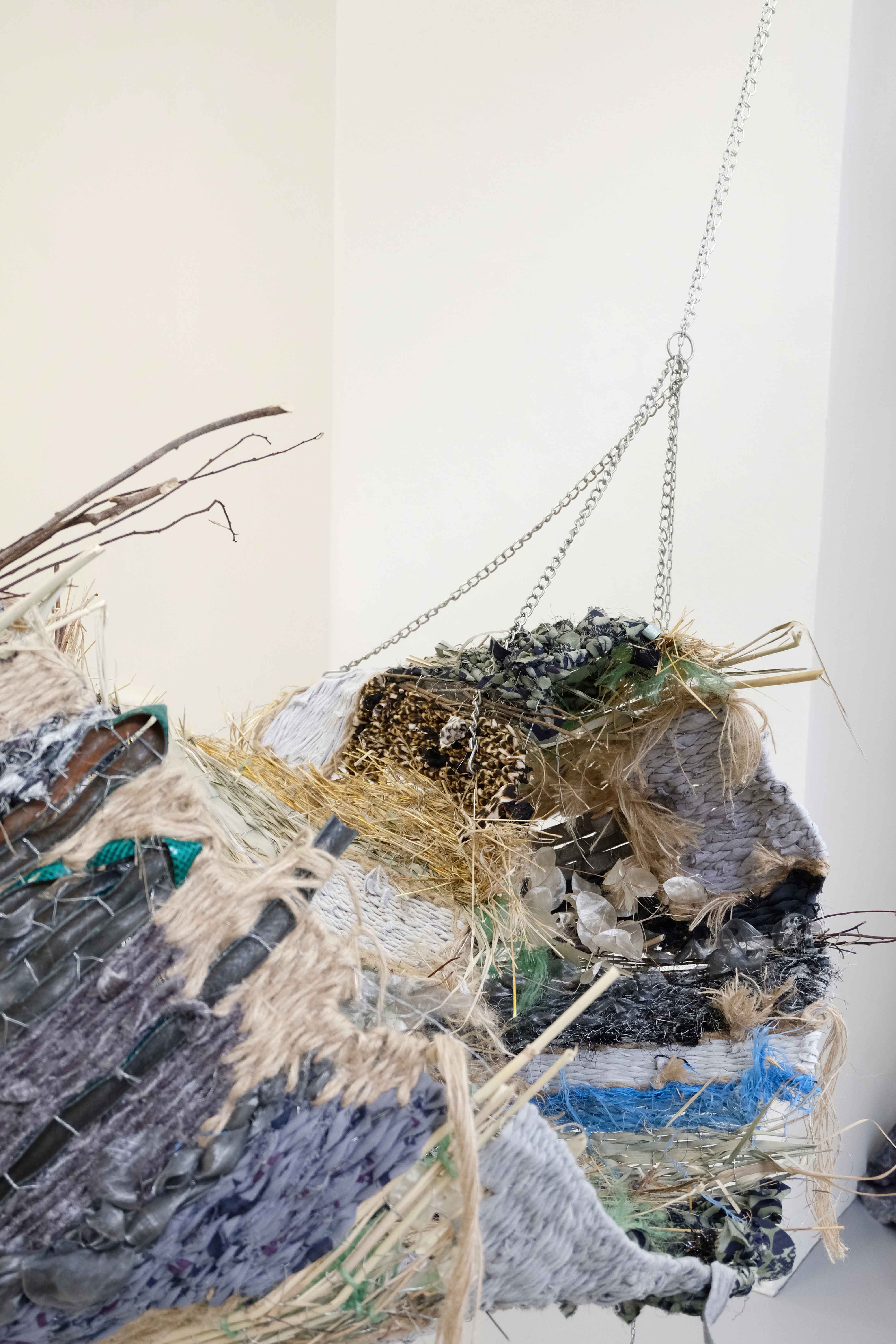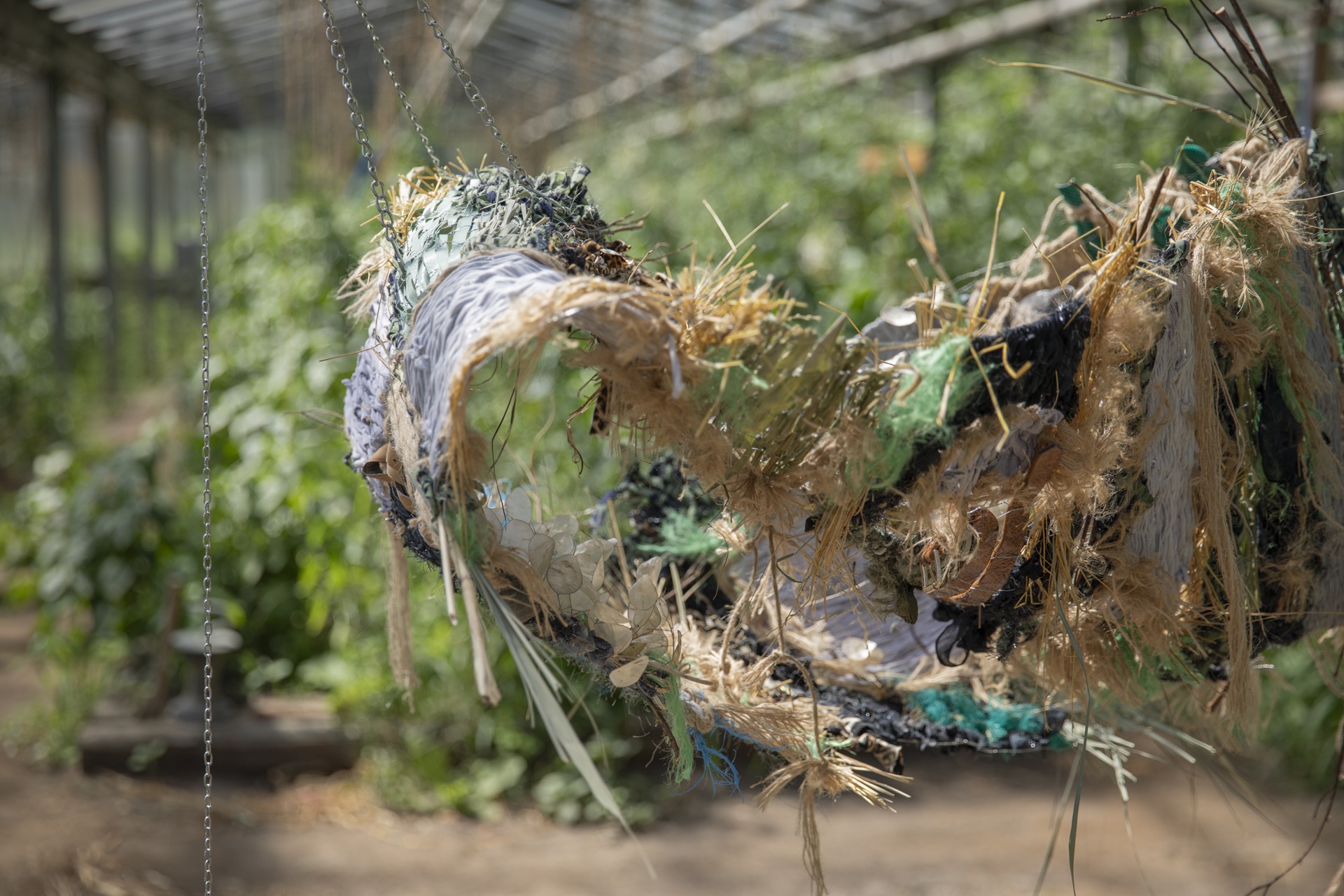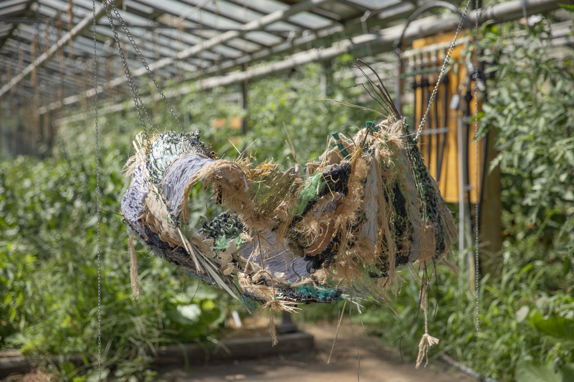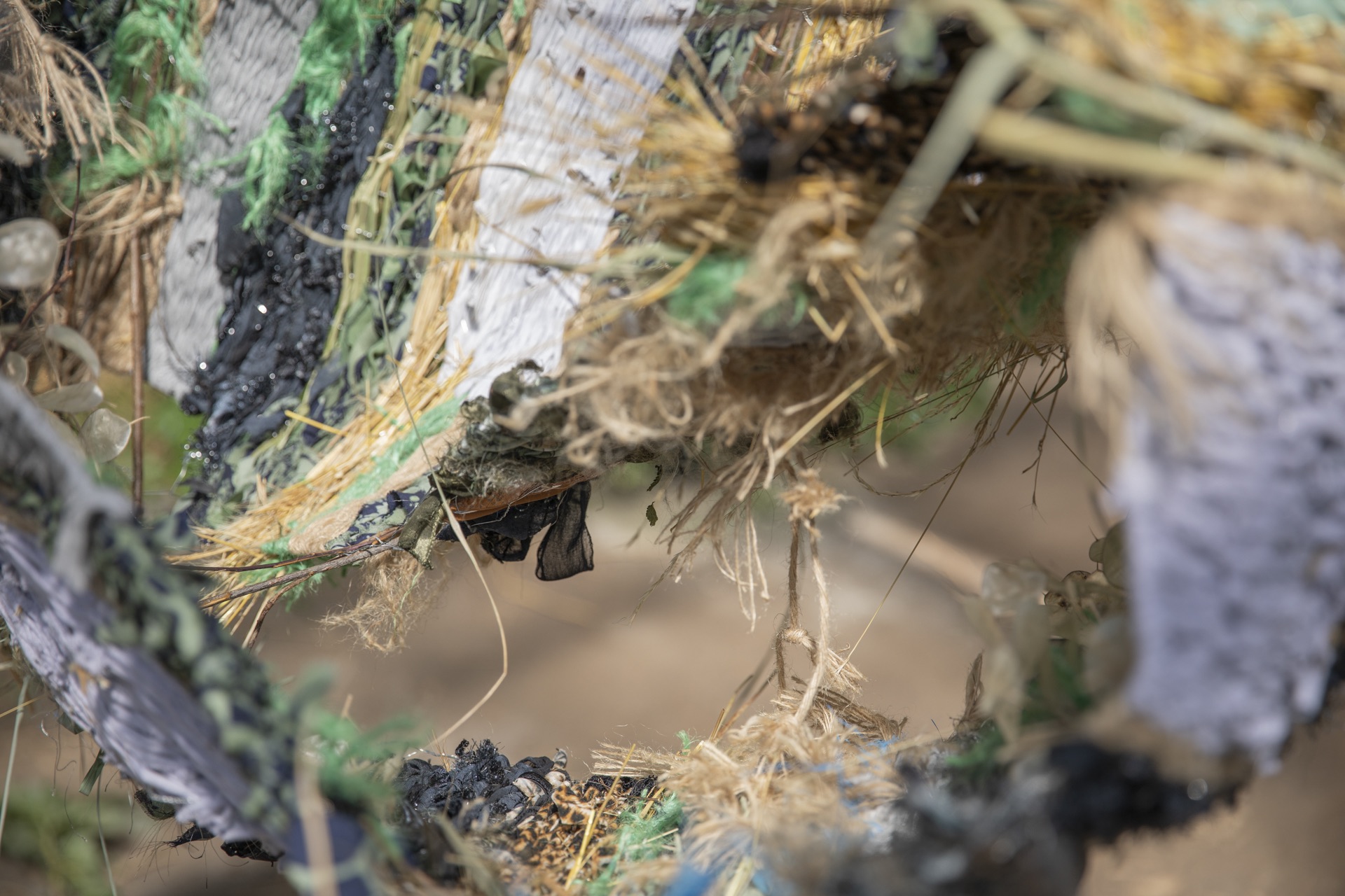 The sculpture is woven out of found objects in the farm, animal-print clothes from the secondhand shops and the many interactions gathered during the symposium. Like the story of the snake, who came to the artist Nikolaus’s studio to eat a mouse caught in the trap, or the mystery of the sudden appearance of crustaceans in the yard: Stadtfarm in Vienna can with it's beautiful lushness of nature reservoir between gray heavily trafficked highways leave one often with the feeling of vertigo. The crossing entanglements and unexpected patterns provide a constant of interrelated growths. Woven during the time spent there, the weaving became like a diary of those relation, reflecting in and out of the process. The shape of the sculpture Möbius strip is taken from the concept of physics, where one cant clearly tell which side of the surface they are, when following the shape with their hand or eyes. The shape rotates itself around in a constant process and what is usually inside, is also at one point outside of the shape. In relation to the Kleine Stadt farm, whose manifold work is dedicated to city environmental farming and sustainability, the work questions what feels like nature and what is considered natural (leopard print pants as camouflage in Europe?) in anthropogenic world in polycrises.