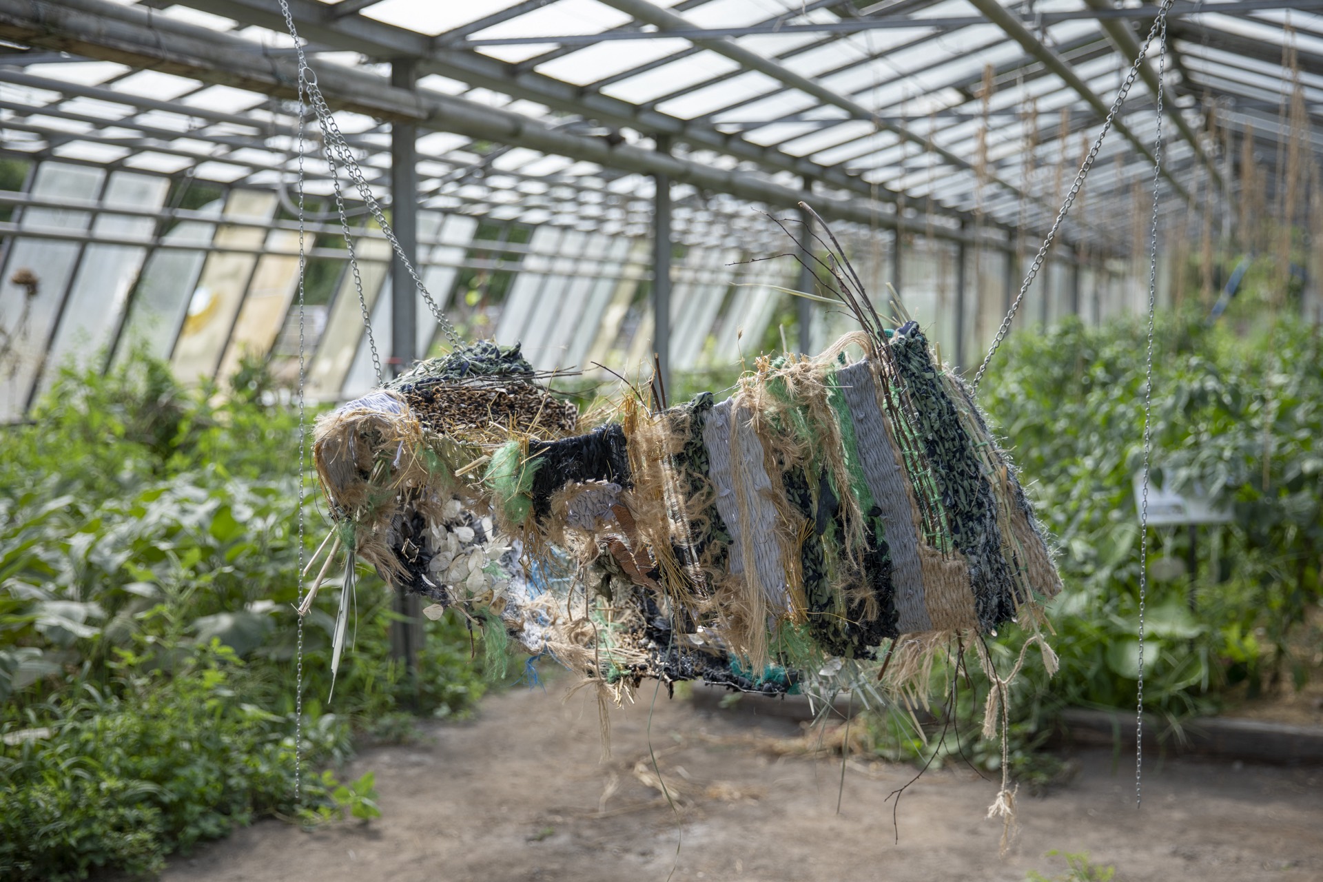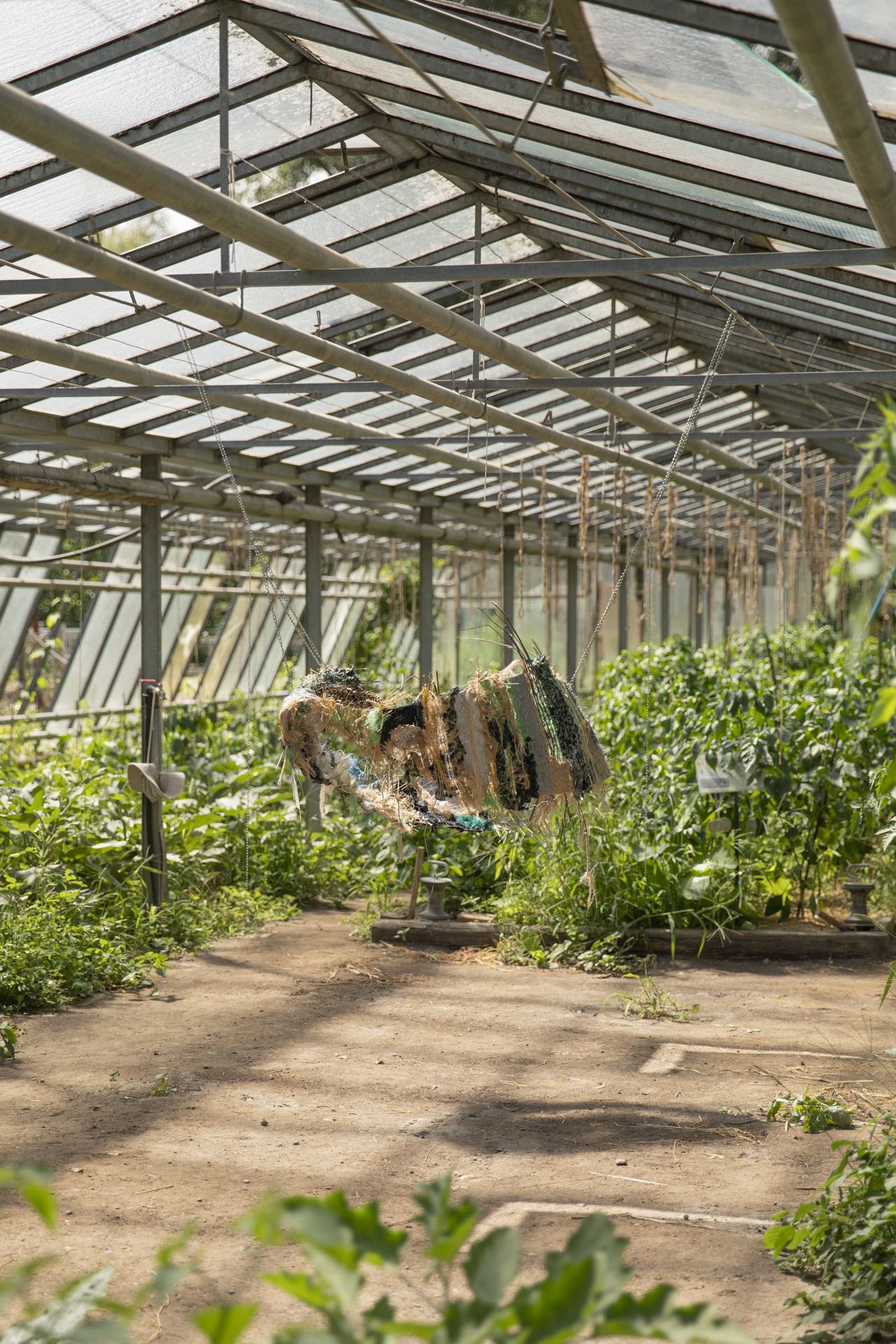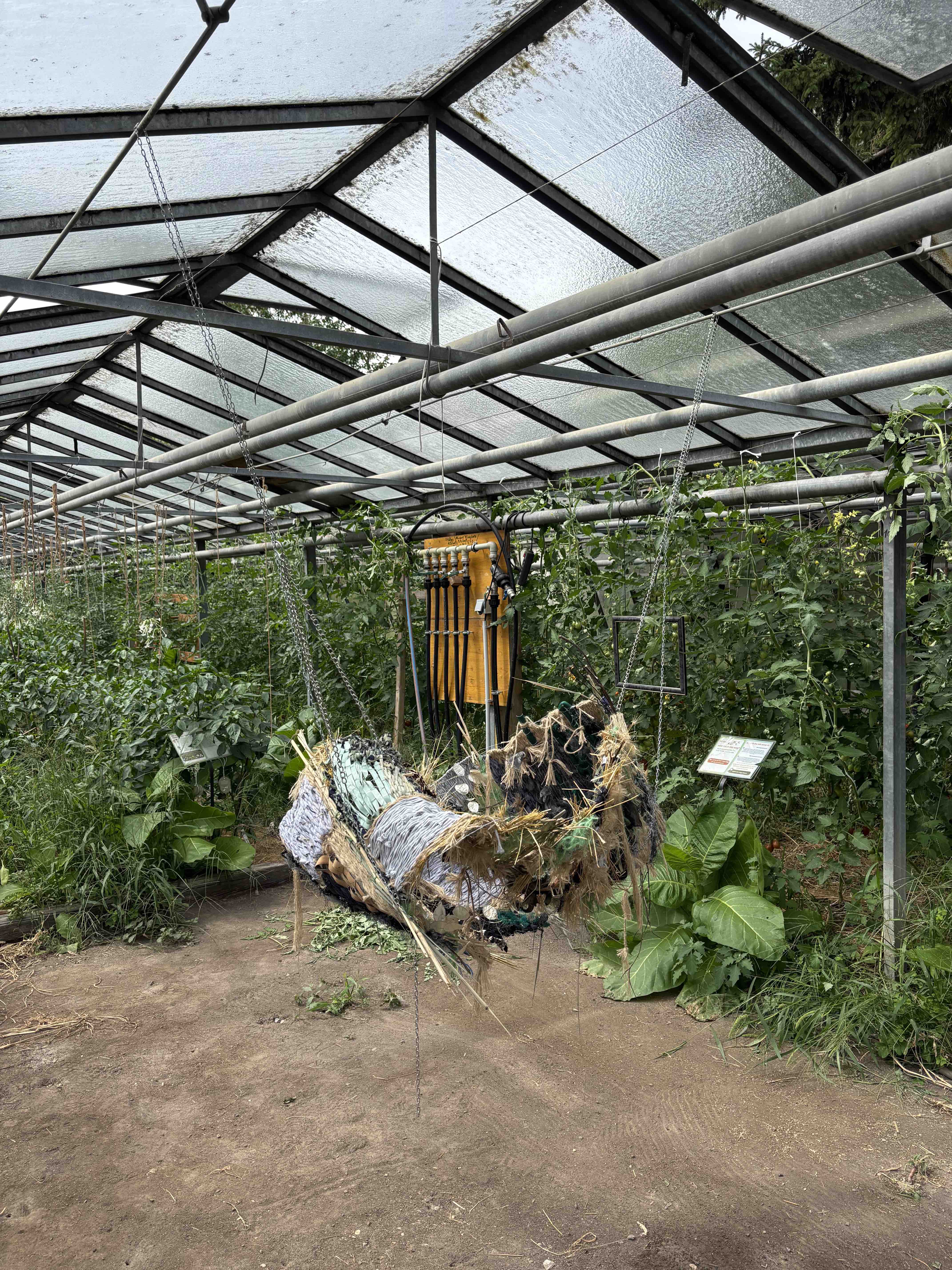 collected clothes, garden hose, jute strings, plants from the Lobau area, plastic from the compost, chicken wire, belts, metal chains