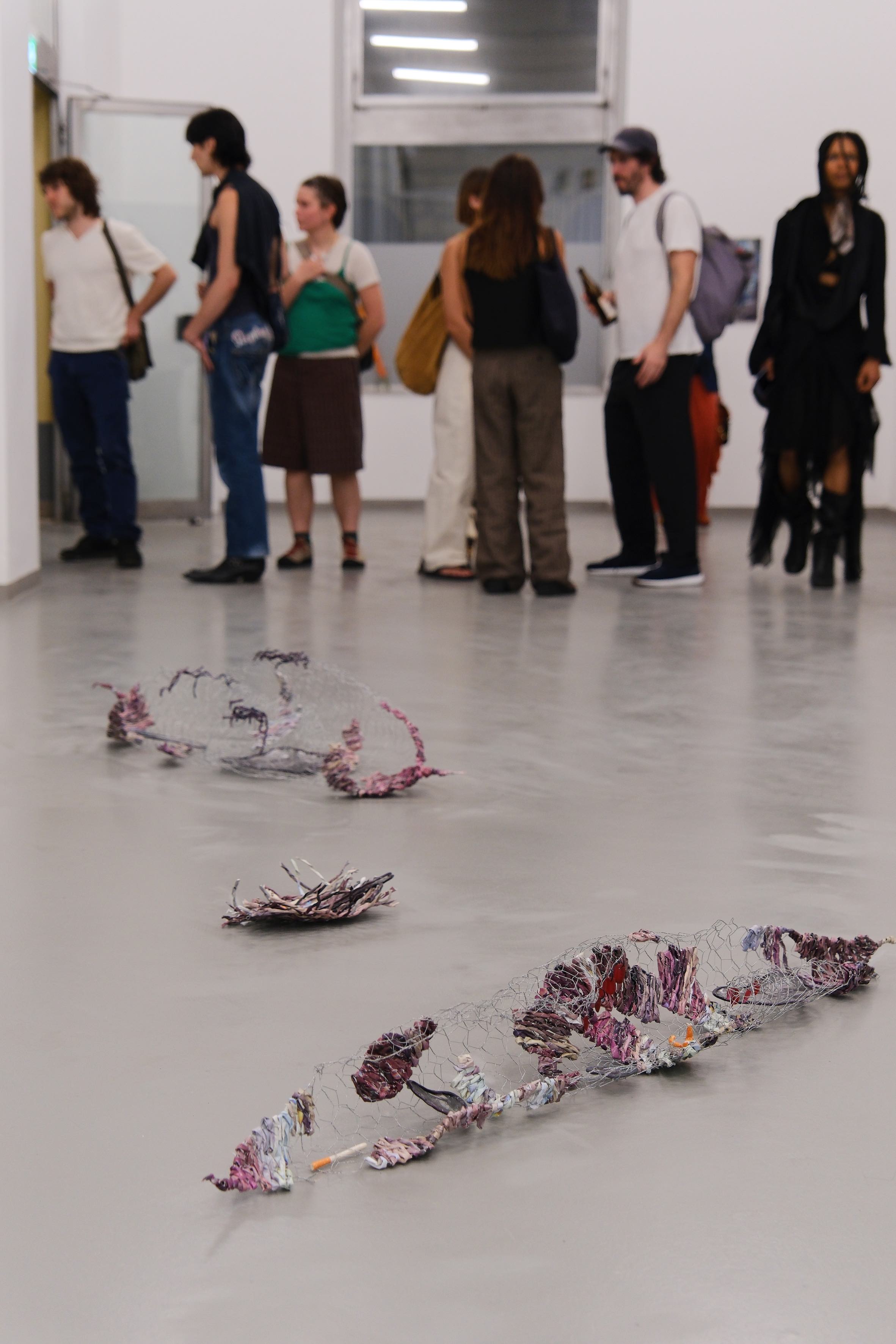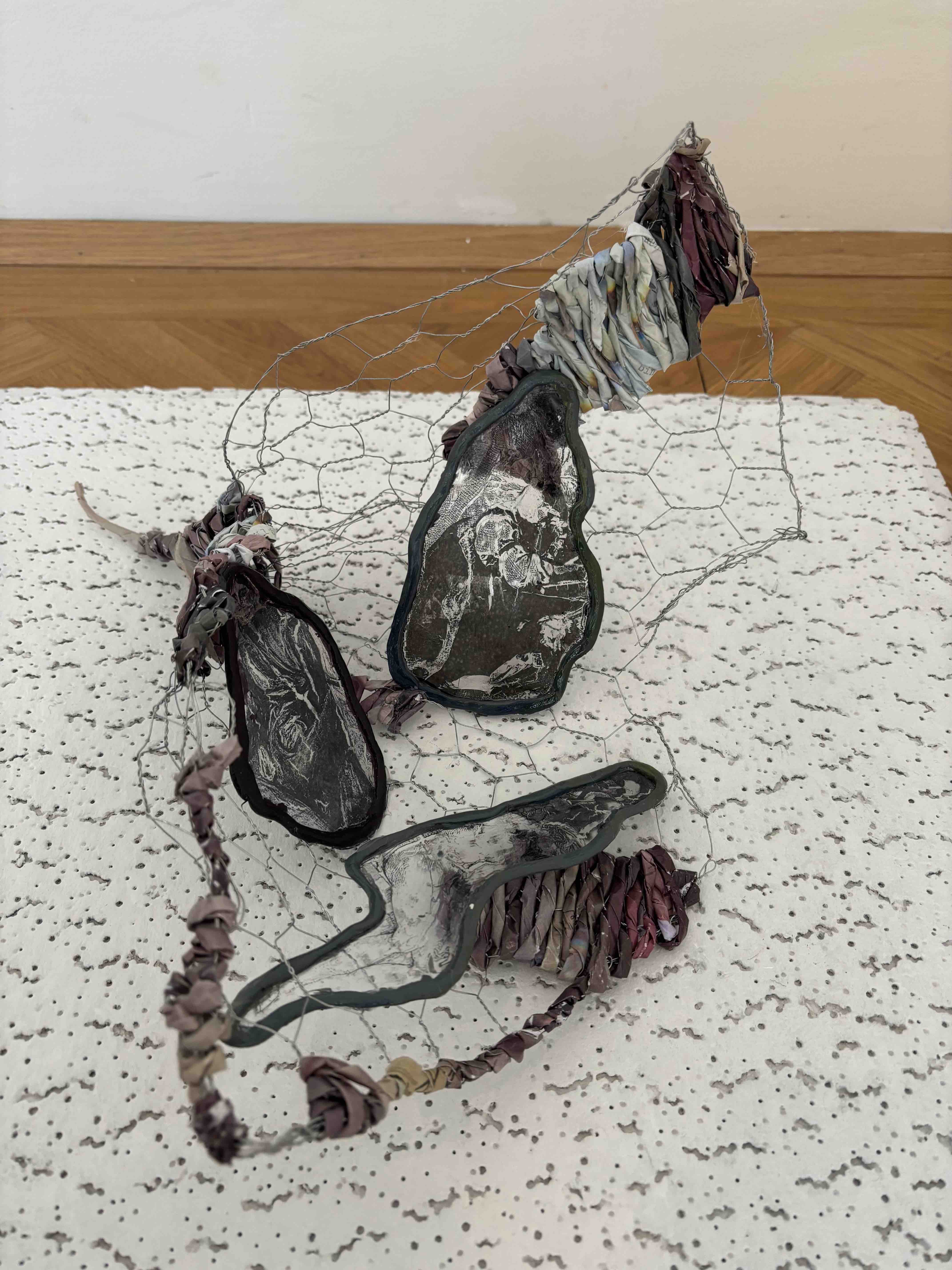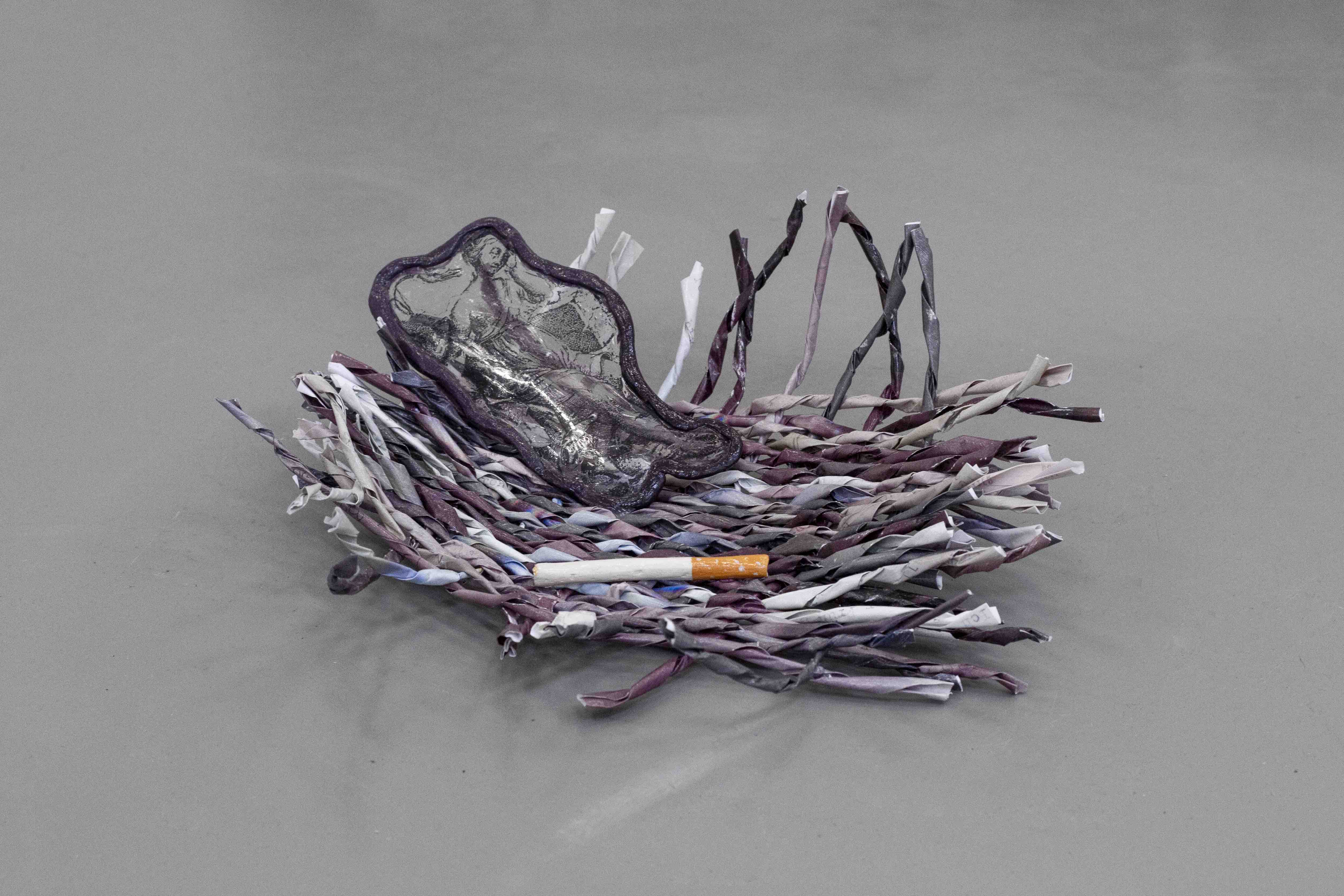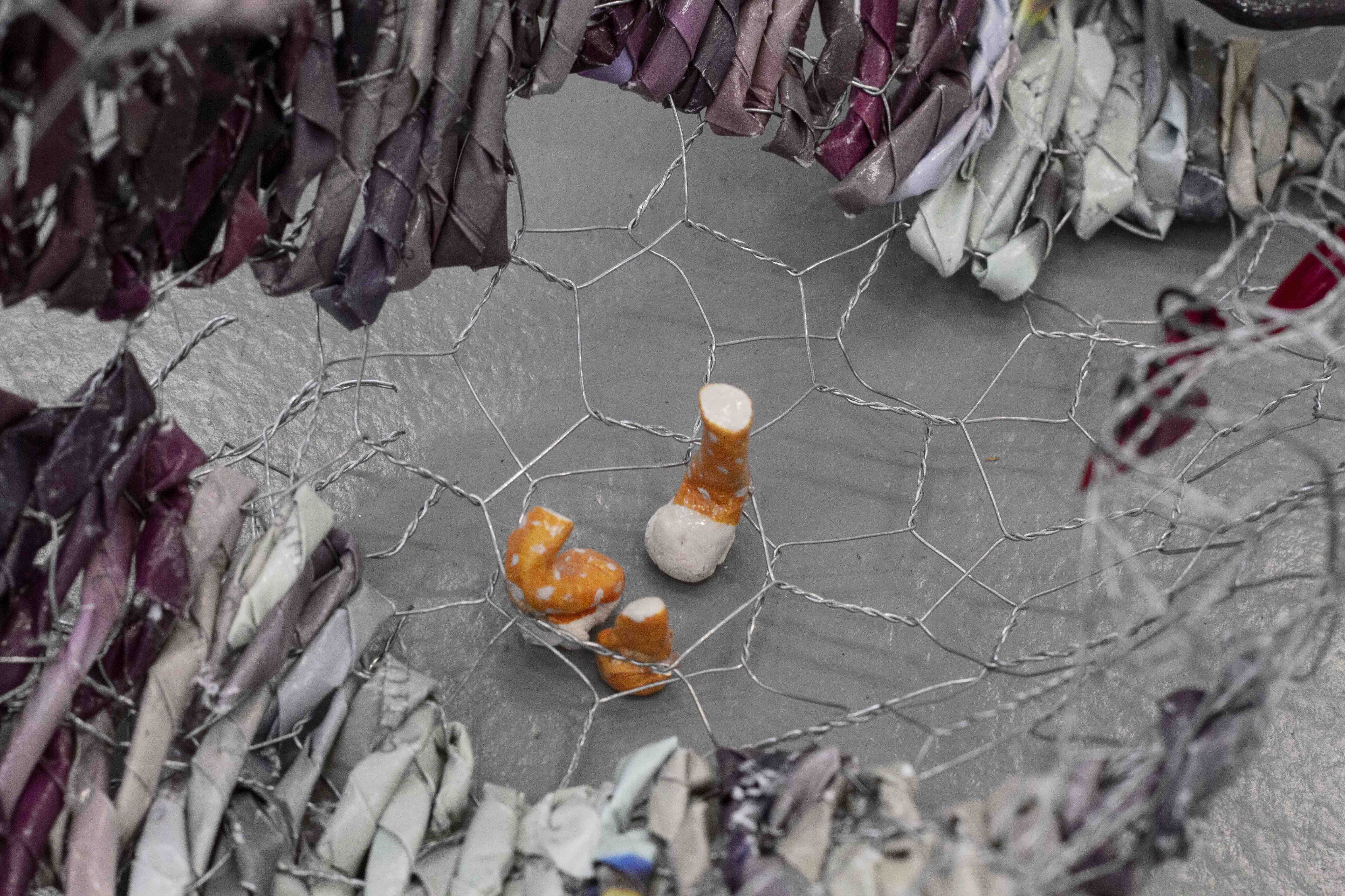 Cigarette buds, bare sculpture wire, unfinished weavings stretching outwards, crumbling soft clay on hard metal, images of melancholy from Cathrin Pichler’s research in her archive of her personal notes, red nails hanging heavy with gravity, a piece of a 80’s office ceiling panel – this work was born out of close interaction with the personal archive of a legendary curator entailing decades of her research, but also in parallel to the many escalations of the current wars around the world. Is every person a tiny world that dies? What can grow out of rubble if one is forced to live in it? In many ways this work deals with grief of the lost worlds that could have been possible, but also celebrates the resistance of the ones growing nonetheless the circumstances. The title is a reference to a term “Planet X” that has been used for a celestial body that is suspected to exist but has not been confirmed yet.