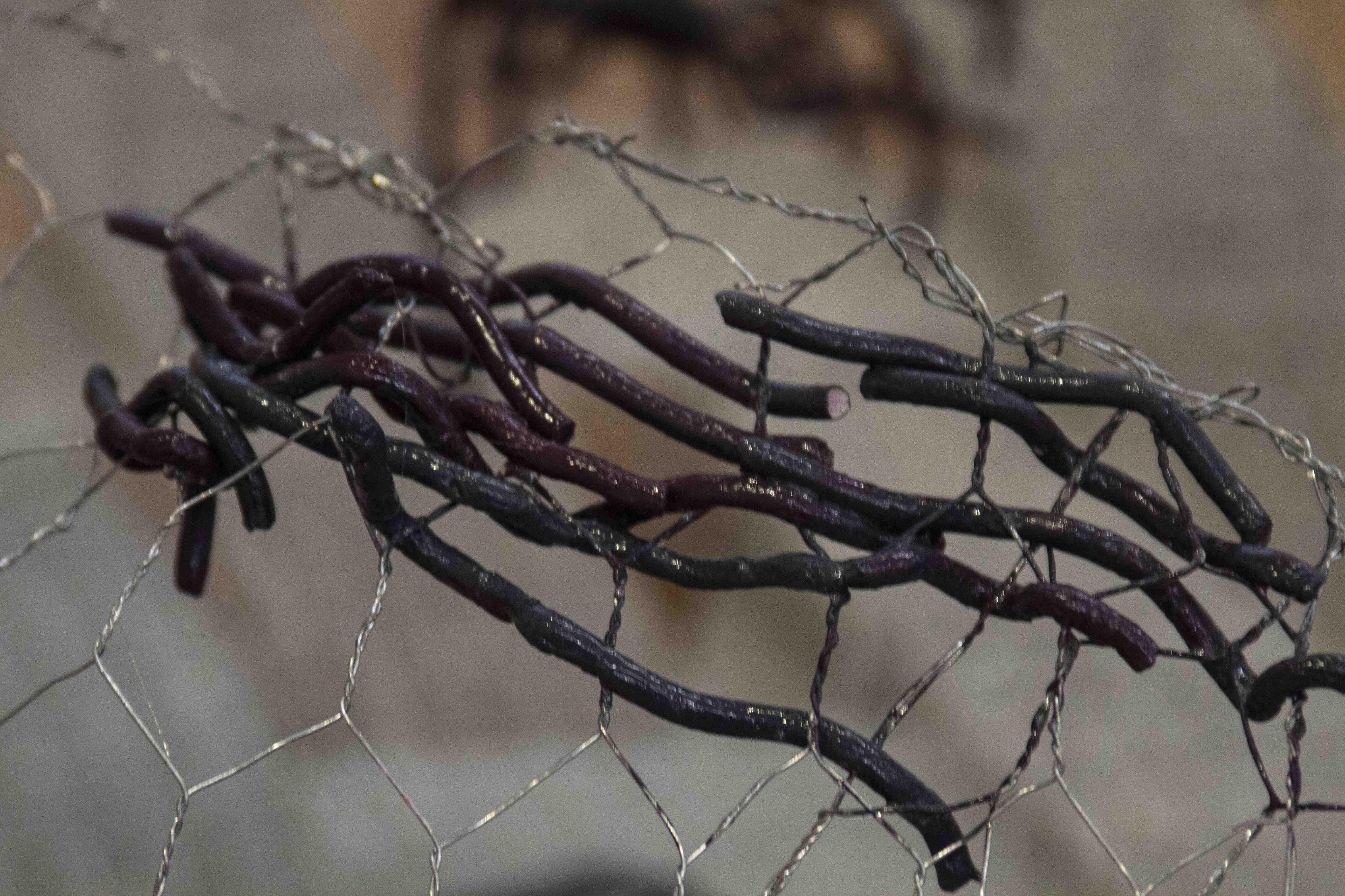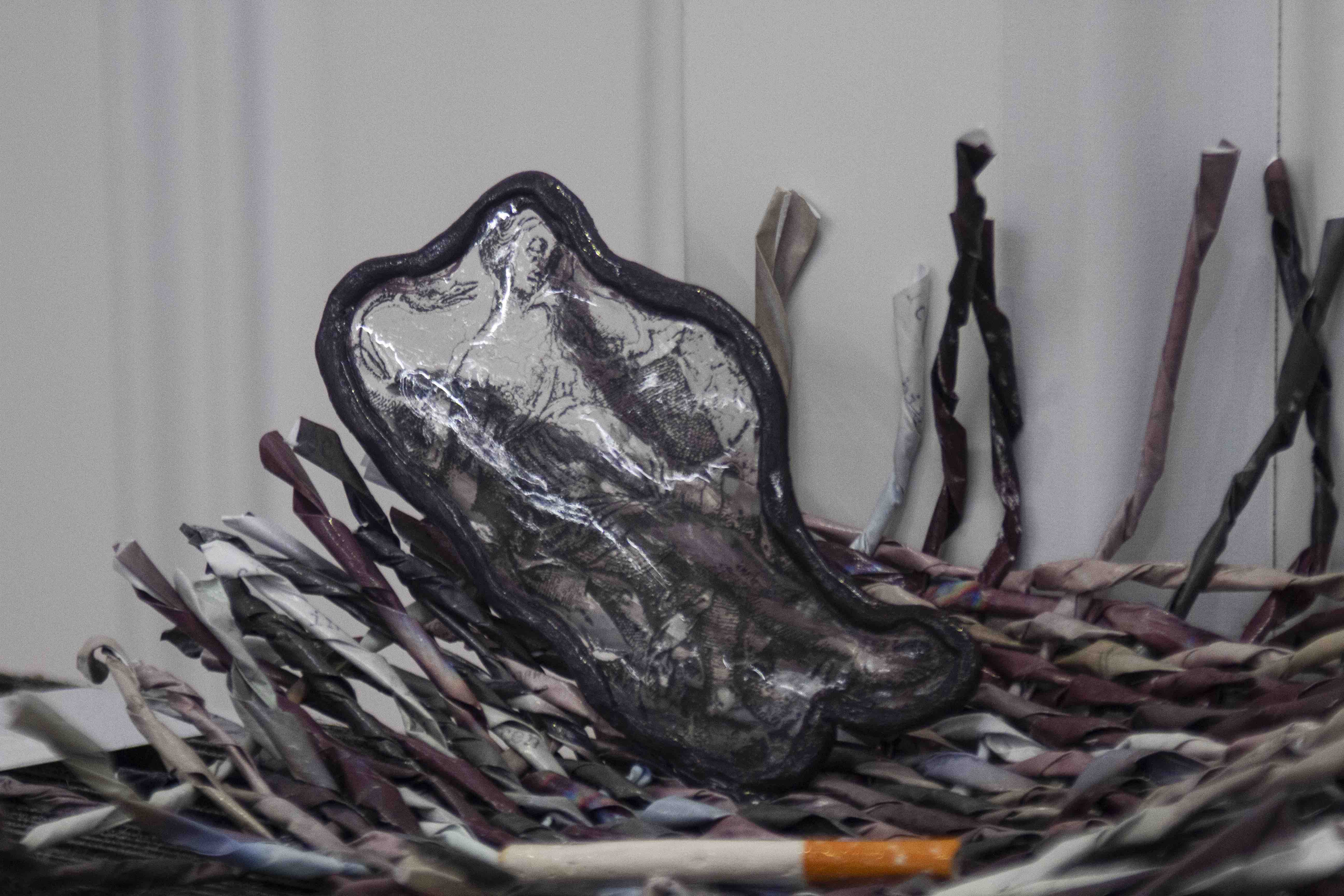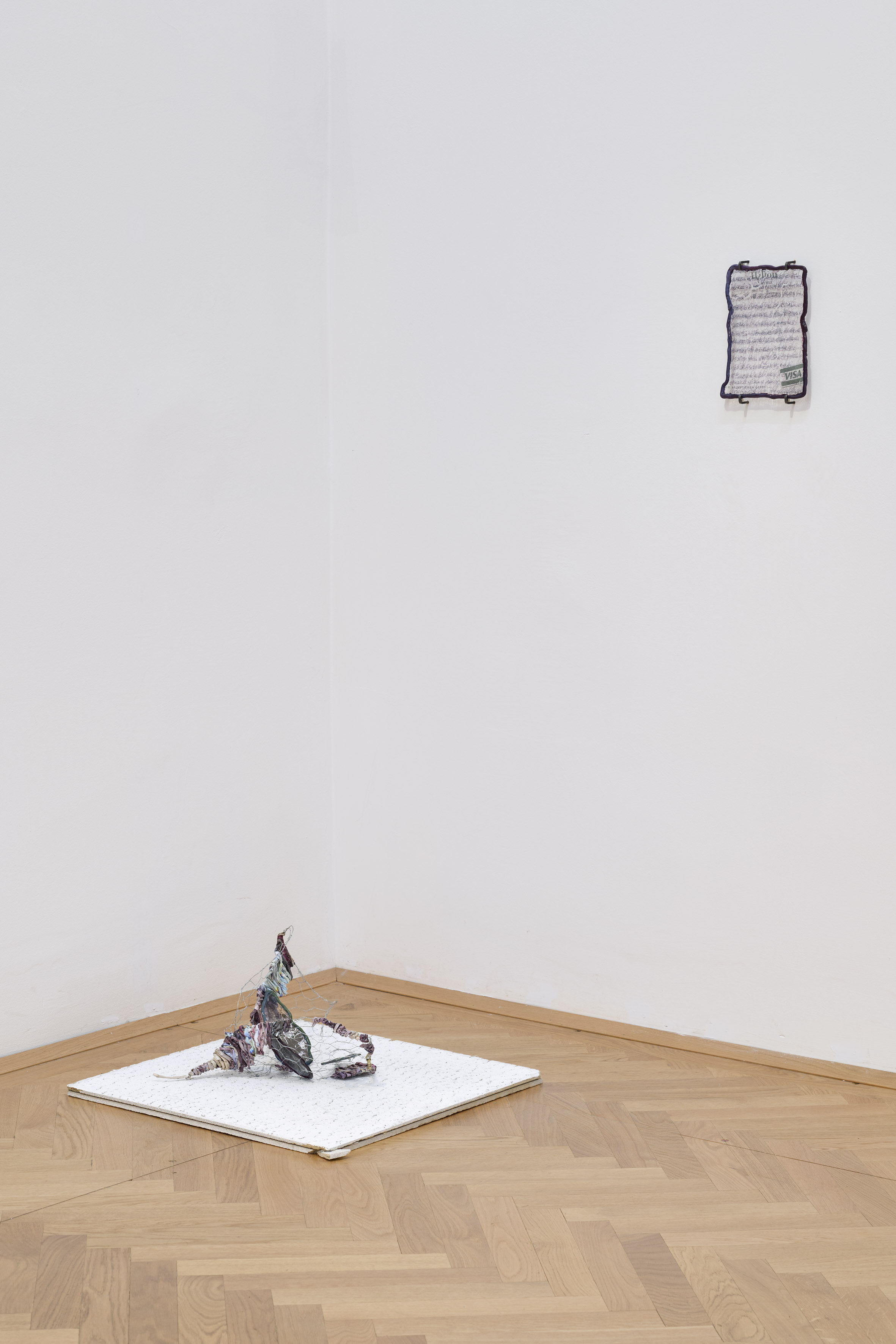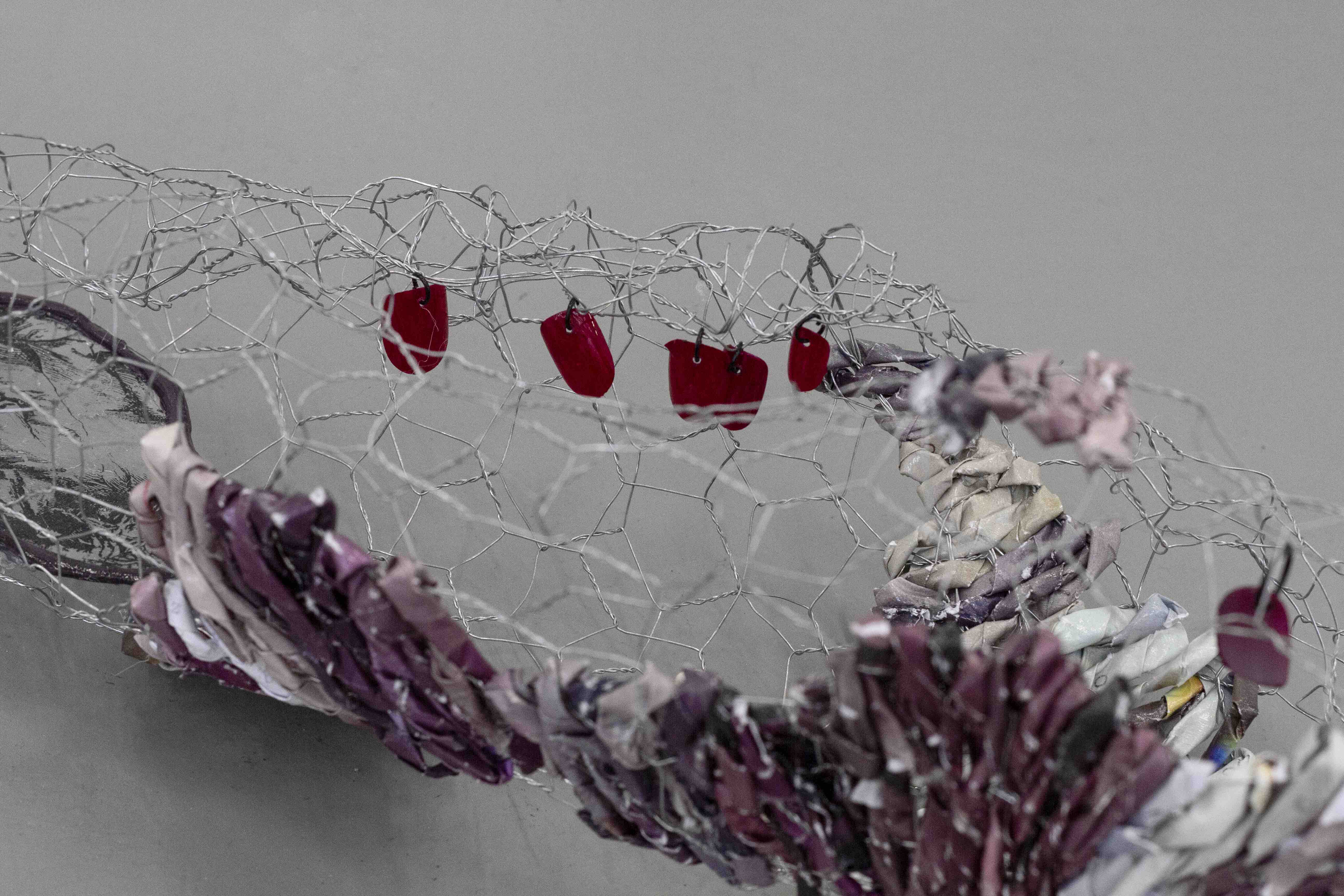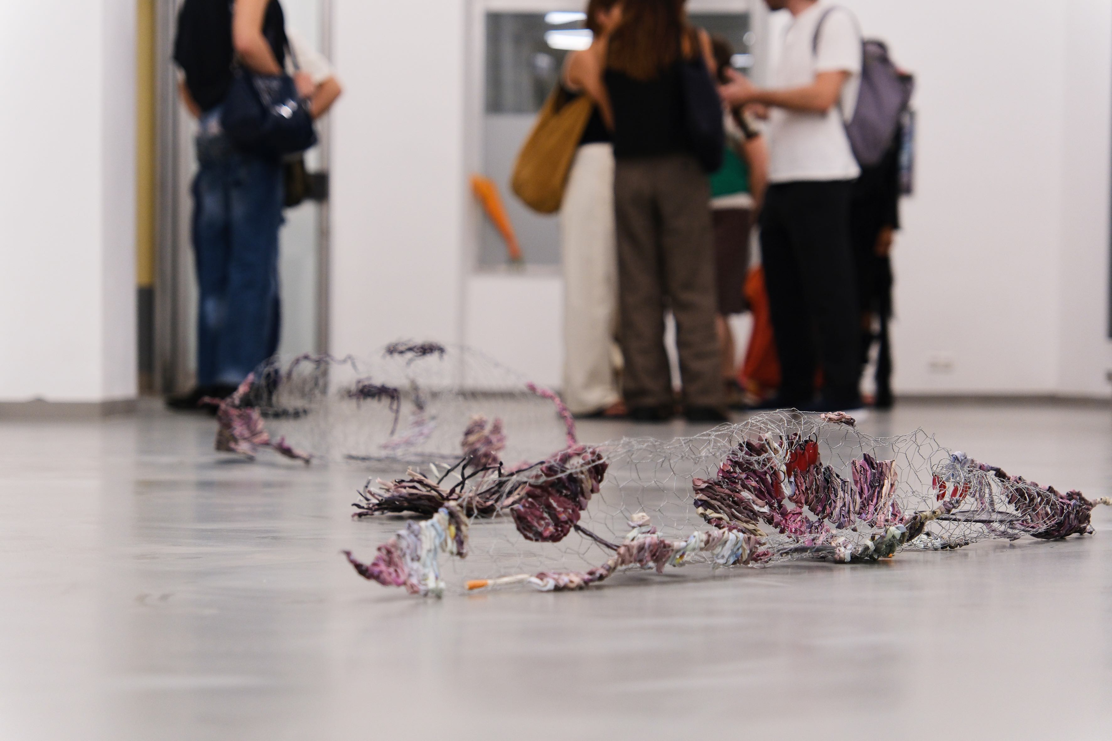 Cigarette buds, bare sculpture wire, unfinished weavings stretching outwards, crumbling soft clay on hard metal, images of melancholy from Cathrin Pichler’s research in her archive of her personal notes, red nails hanging heavy with gravity, a piece of a 80’s office ceiling panel – this work was born out of close interaction with the personal archive of a legendary curator entailing decades of her research, but also in parallel to the many escalations of the current wars around the world. Is every person a tiny world that dies? What can grow out of rubble if one is forced to live in it? In many ways this work deals with grief of the lost worlds that could have been possible, but also celebrates the resistance of the ones growing nonetheless the circumstances. The title is a reference to a term “Planet X” that has been used for a celestial body that is suspected to exist but has not been confirmed yet.