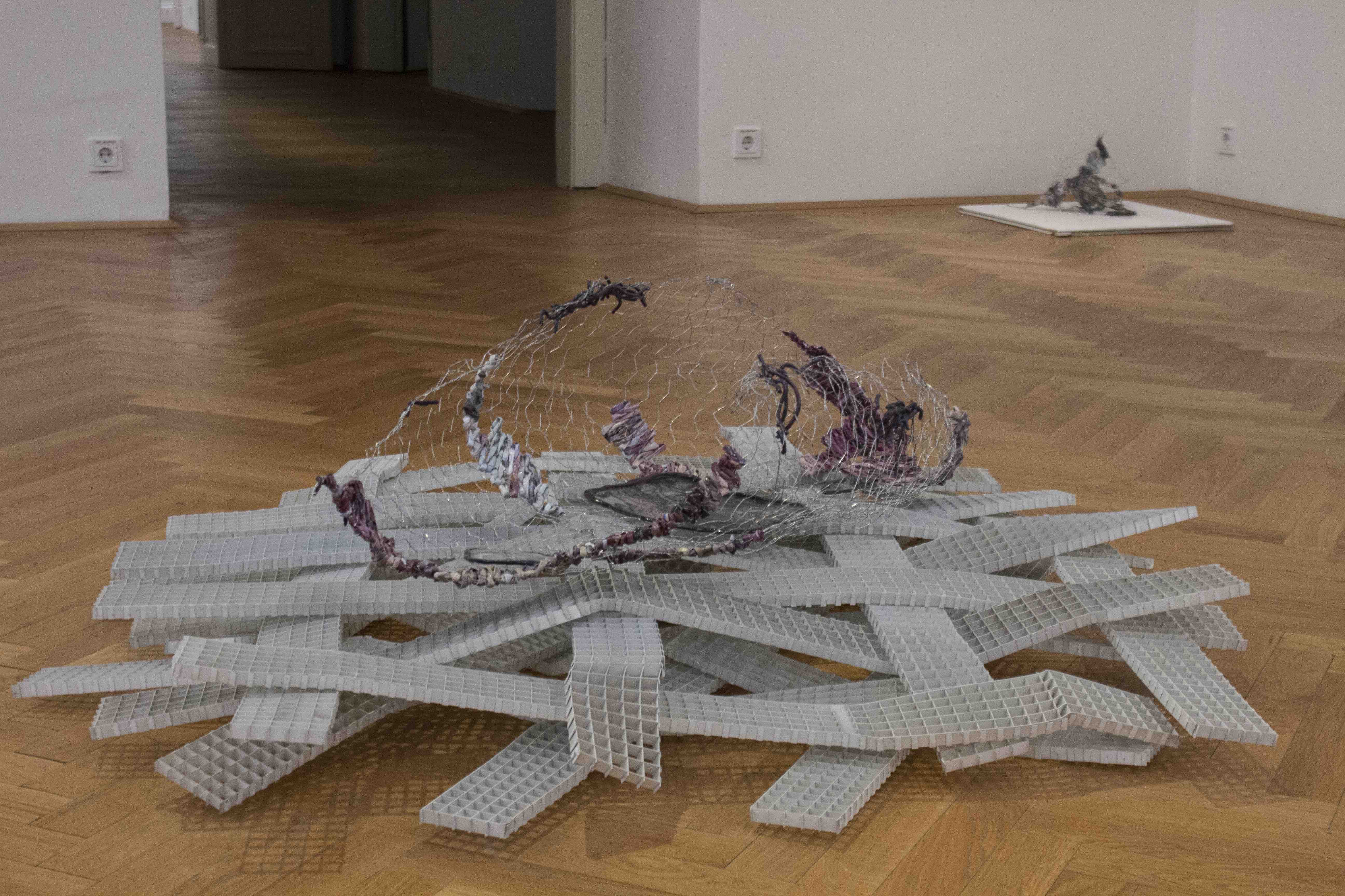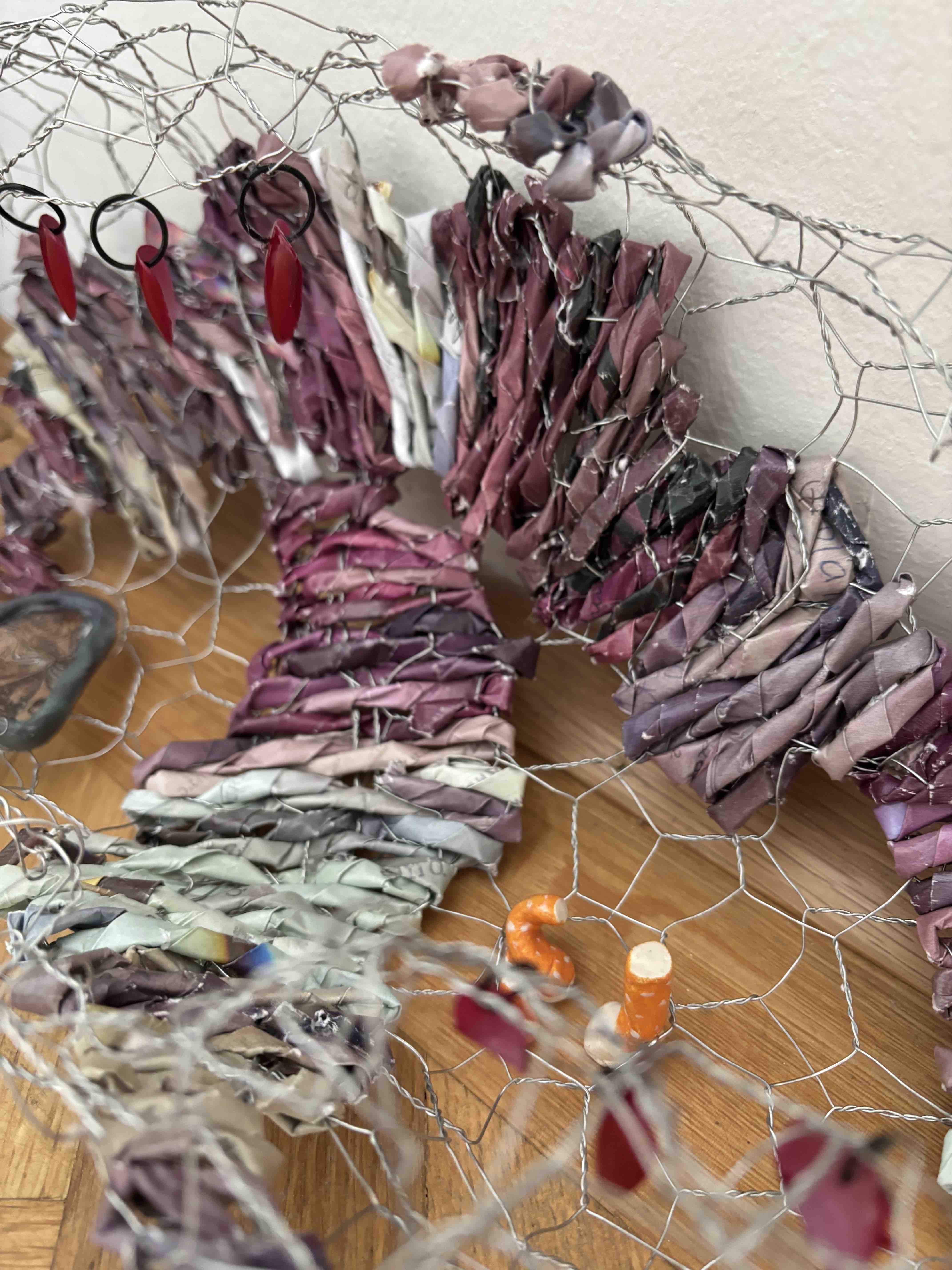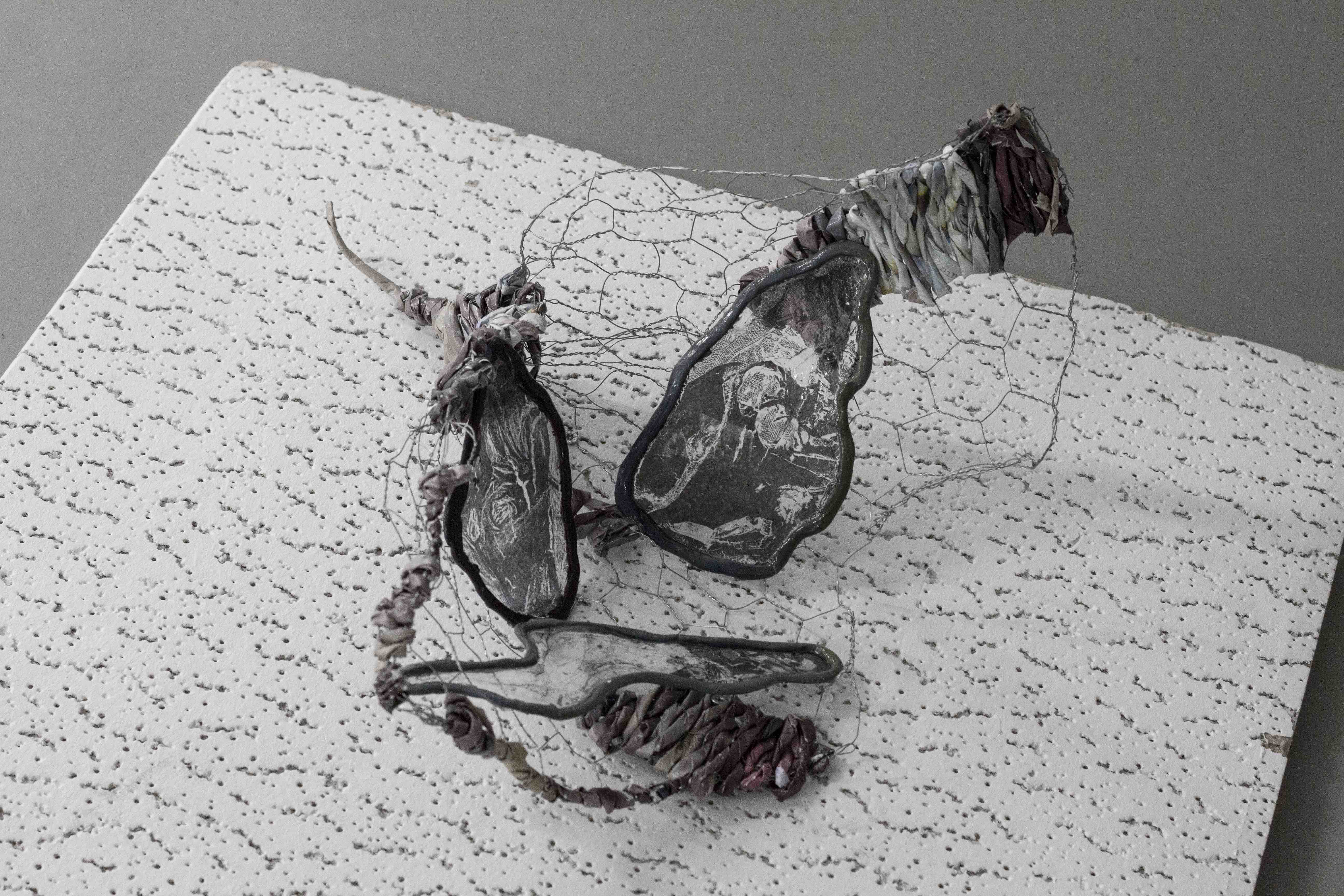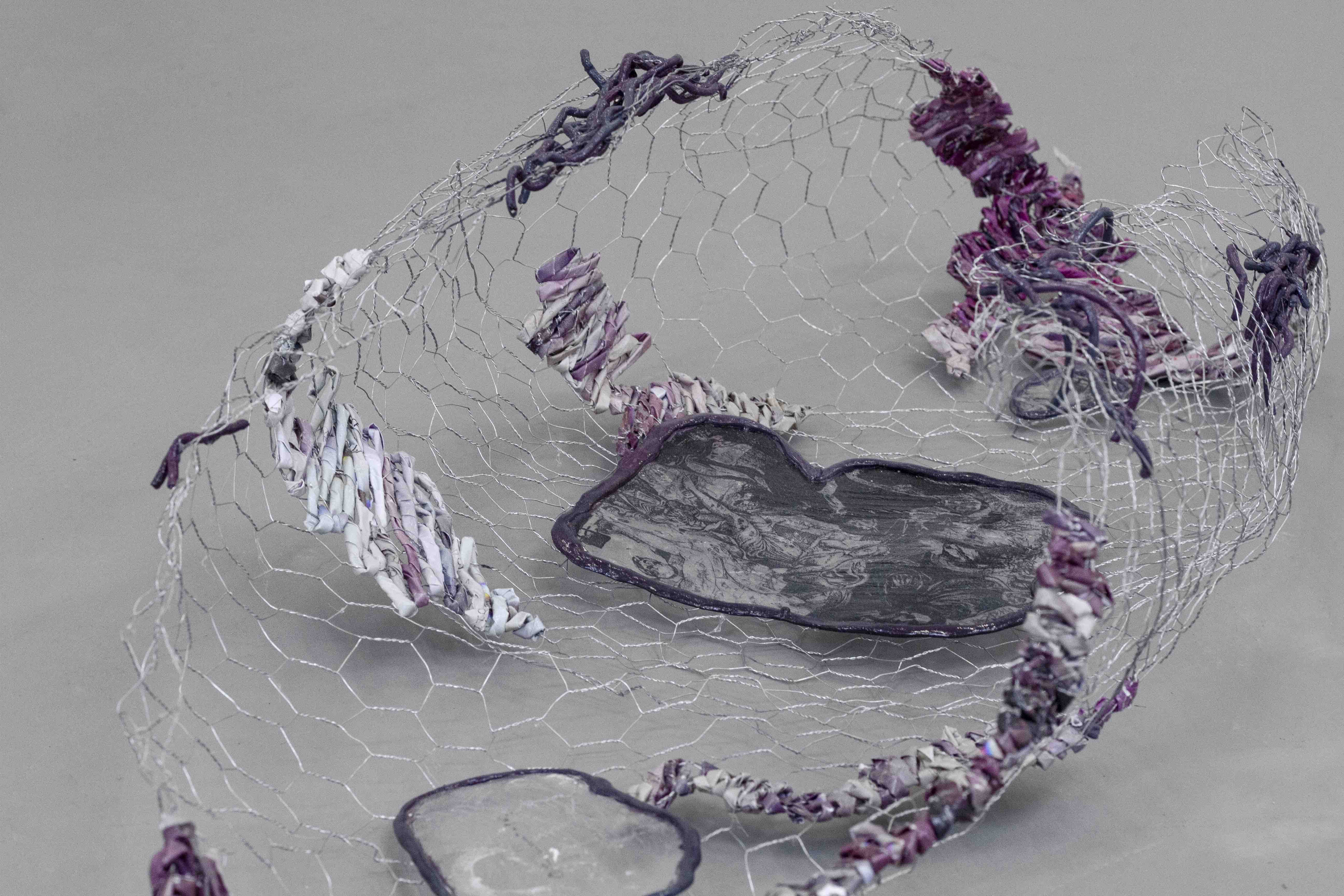 scrap paper, print outs and copies of Cathrin Pichler’s Archive, images printed on plastic folie, chicken wire, lacquer, pigment, acryl, clay, fake nails